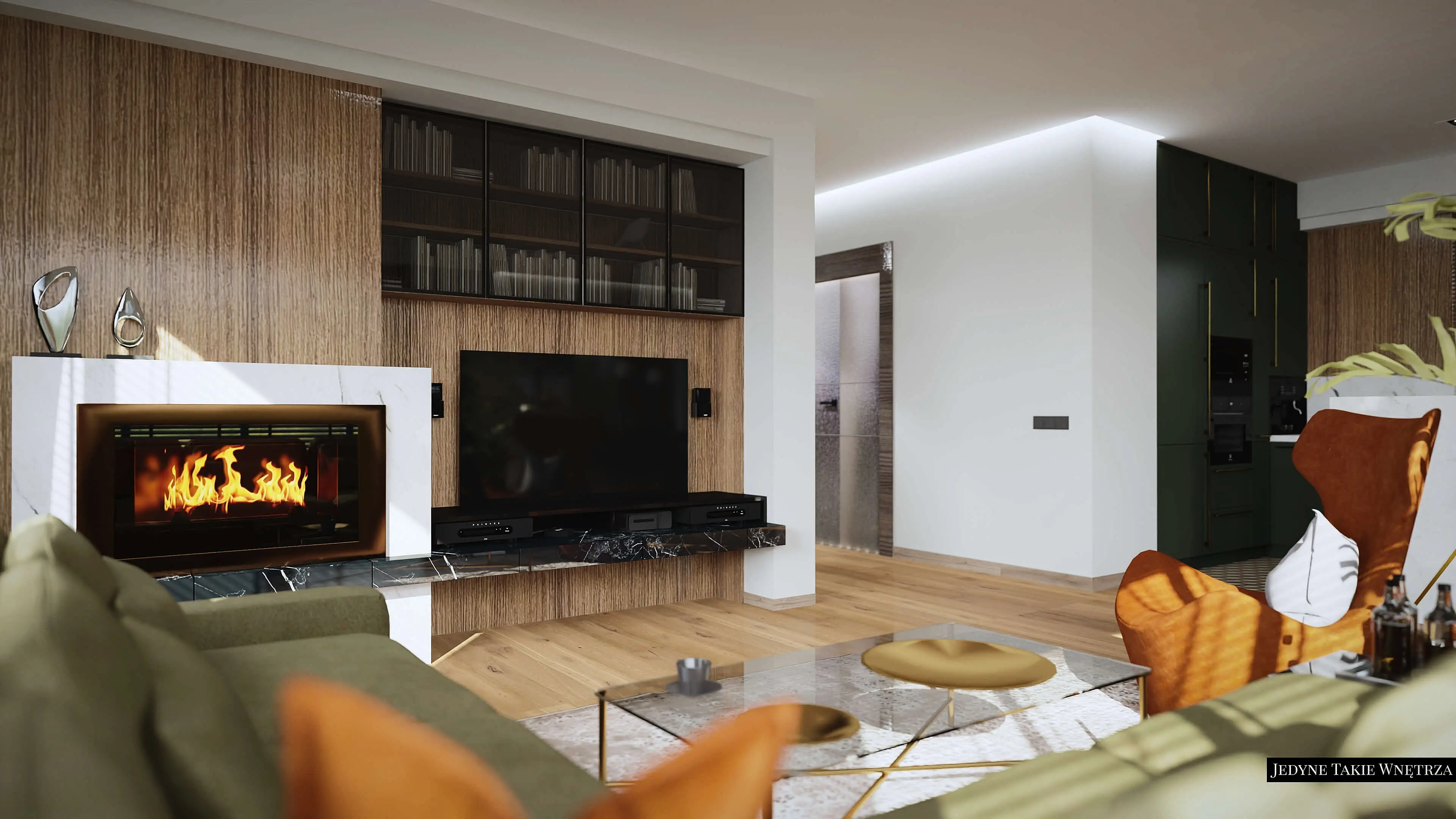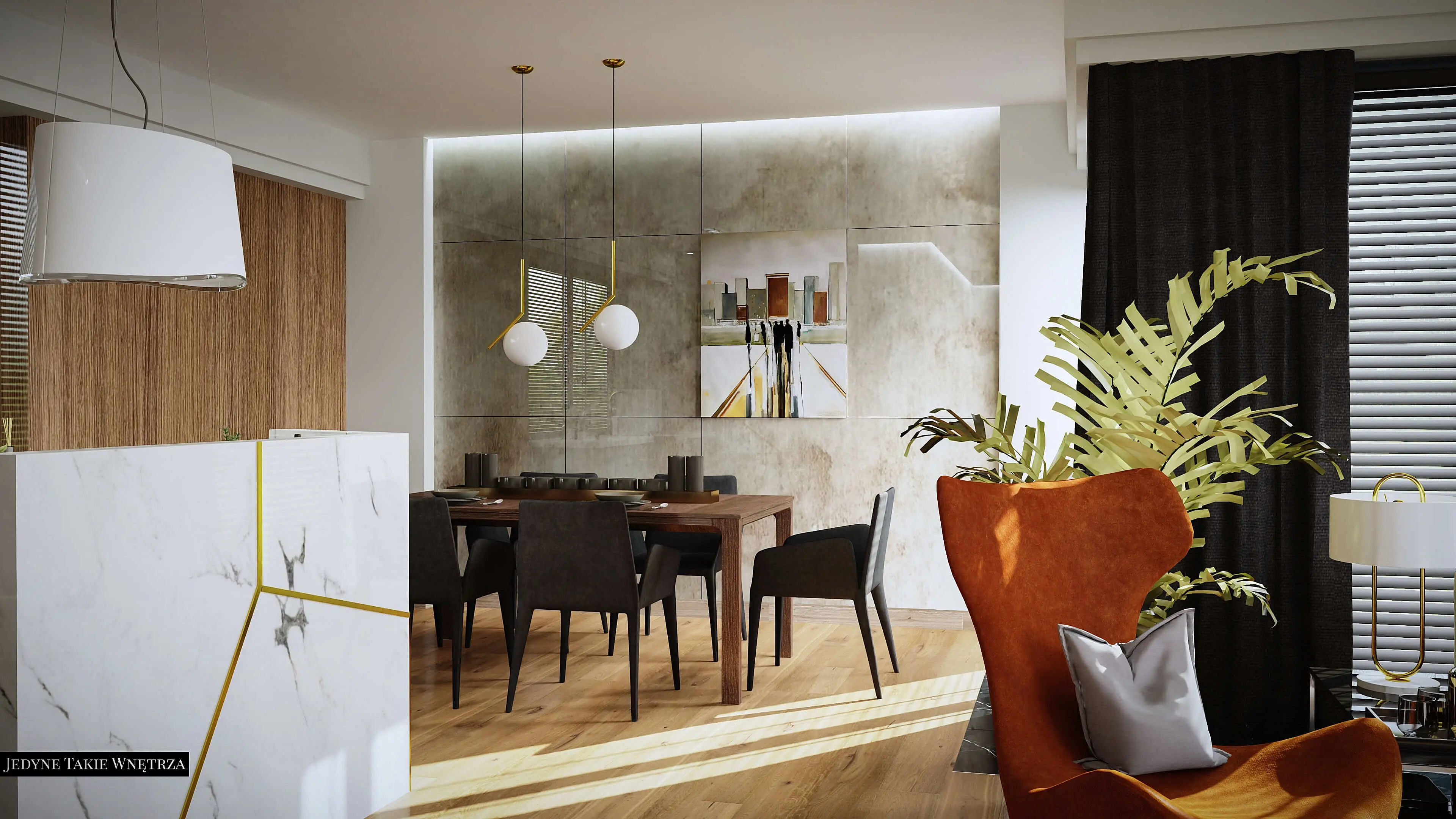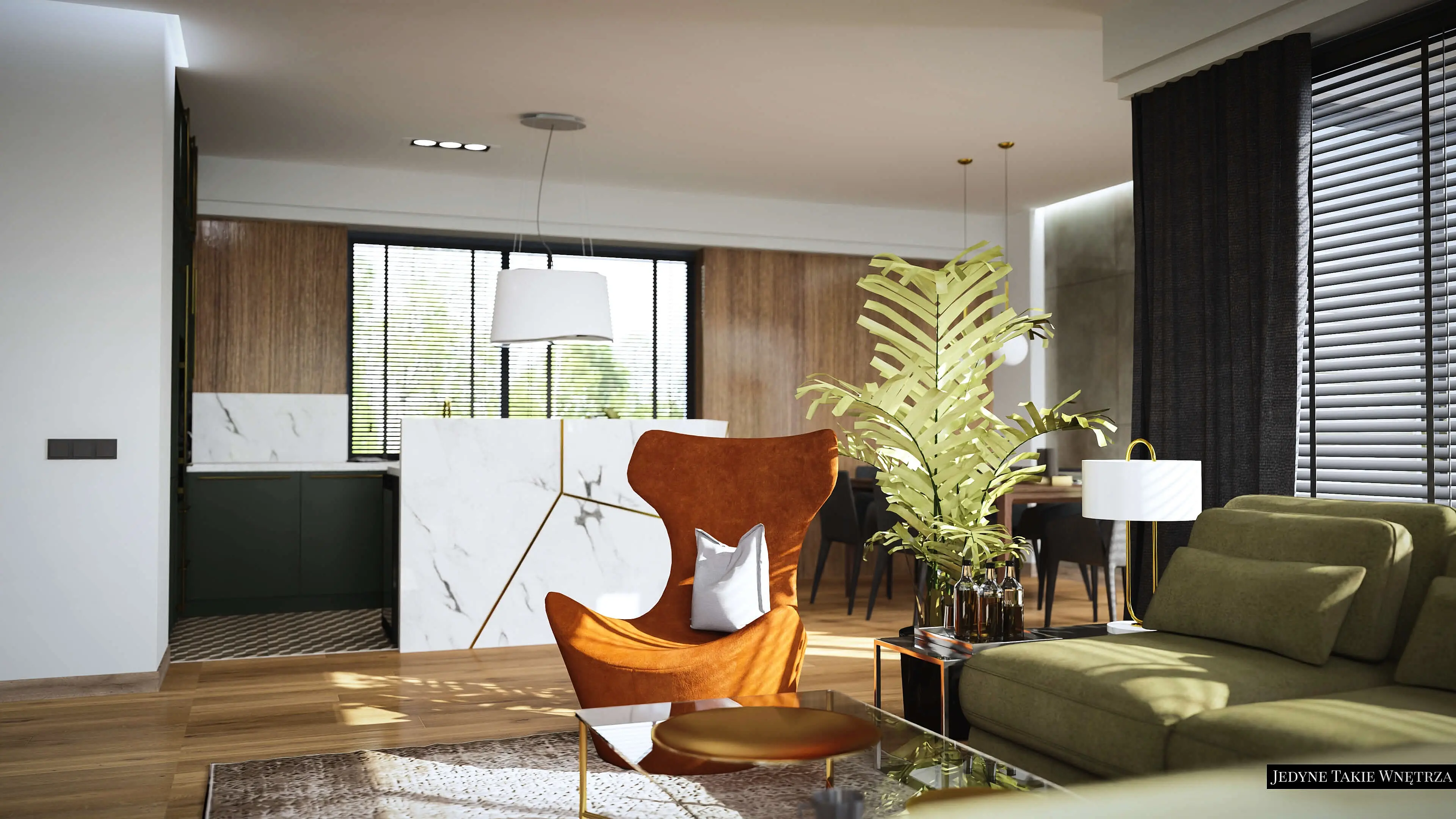 Eleganckie wnętrza salonu z kuchnią z wyspą.
