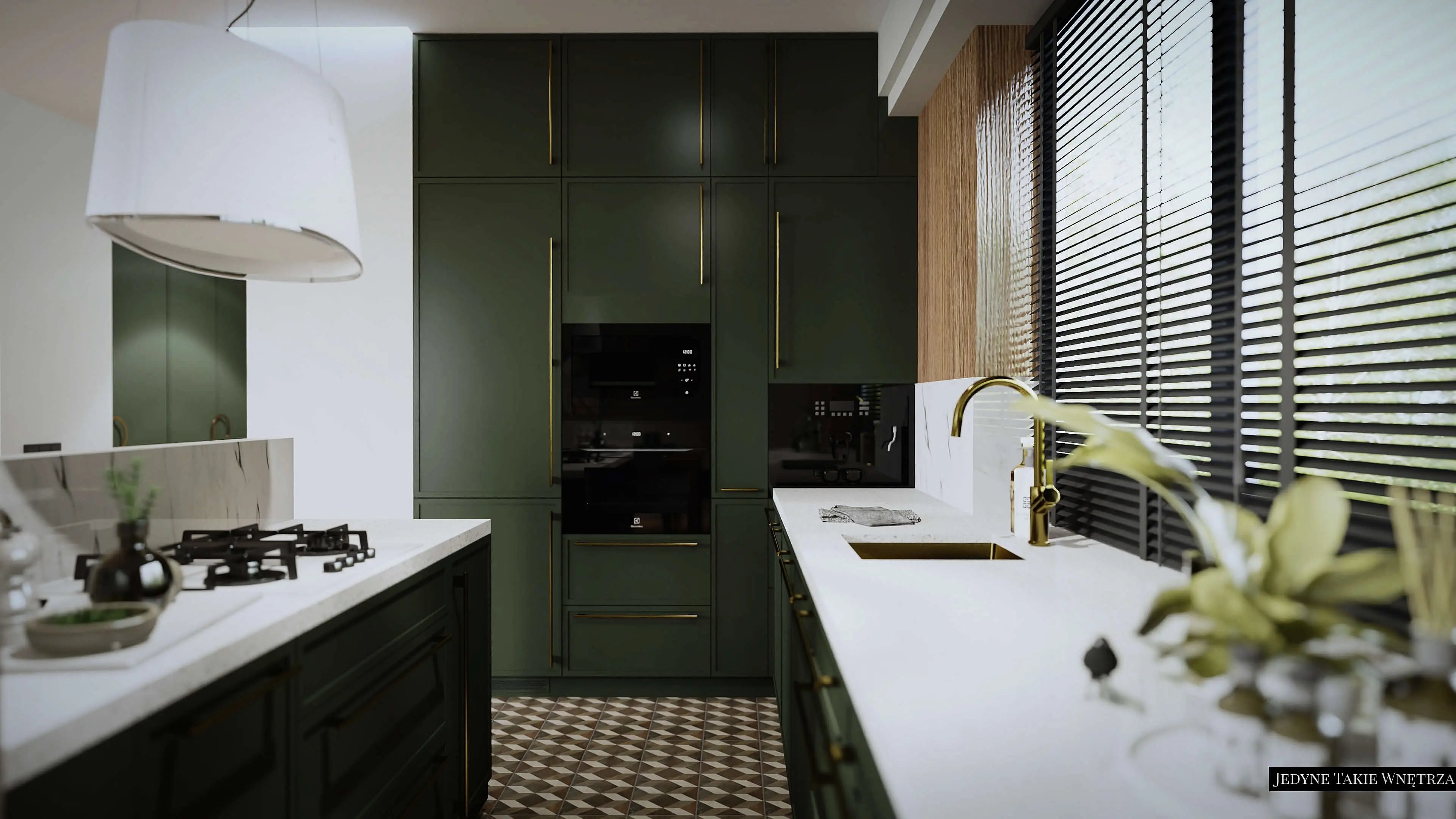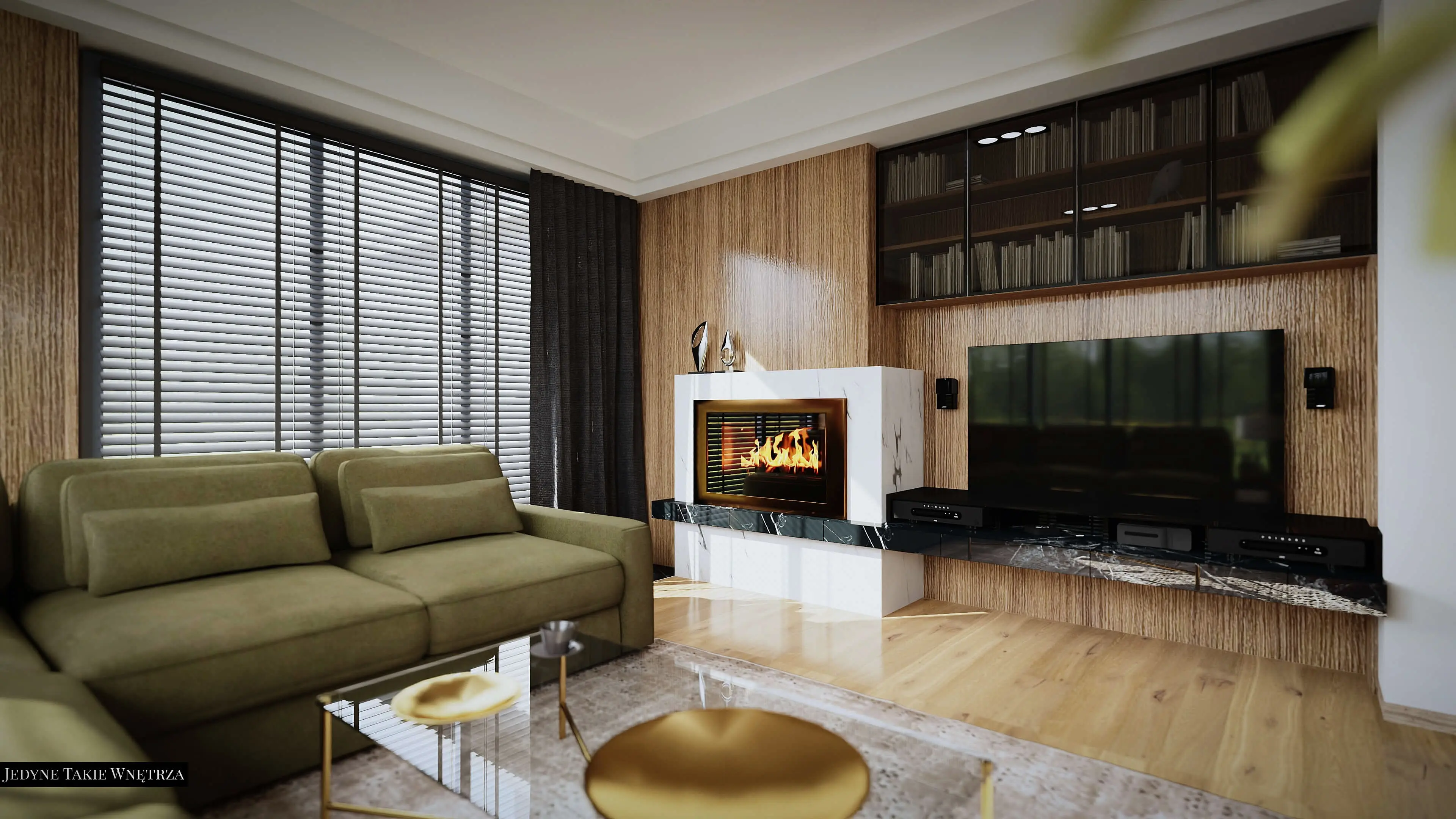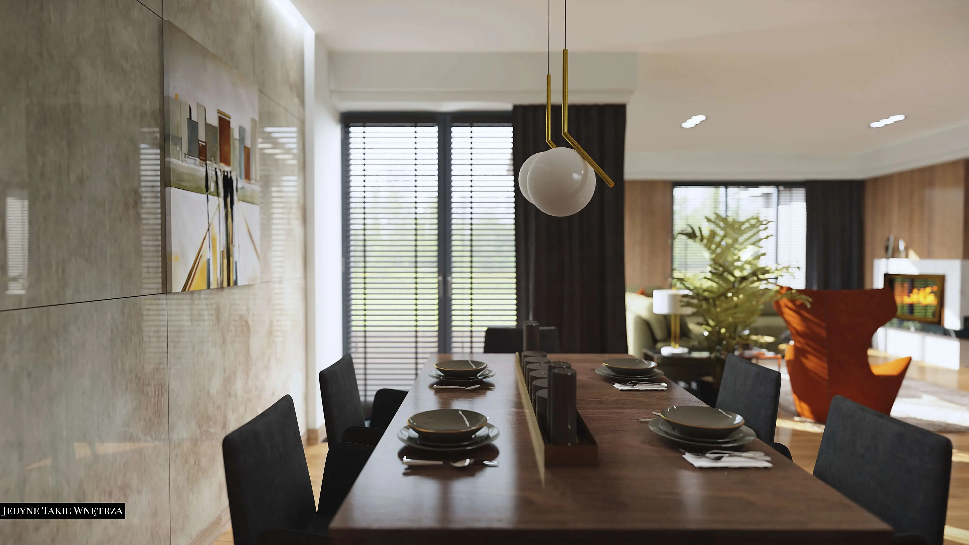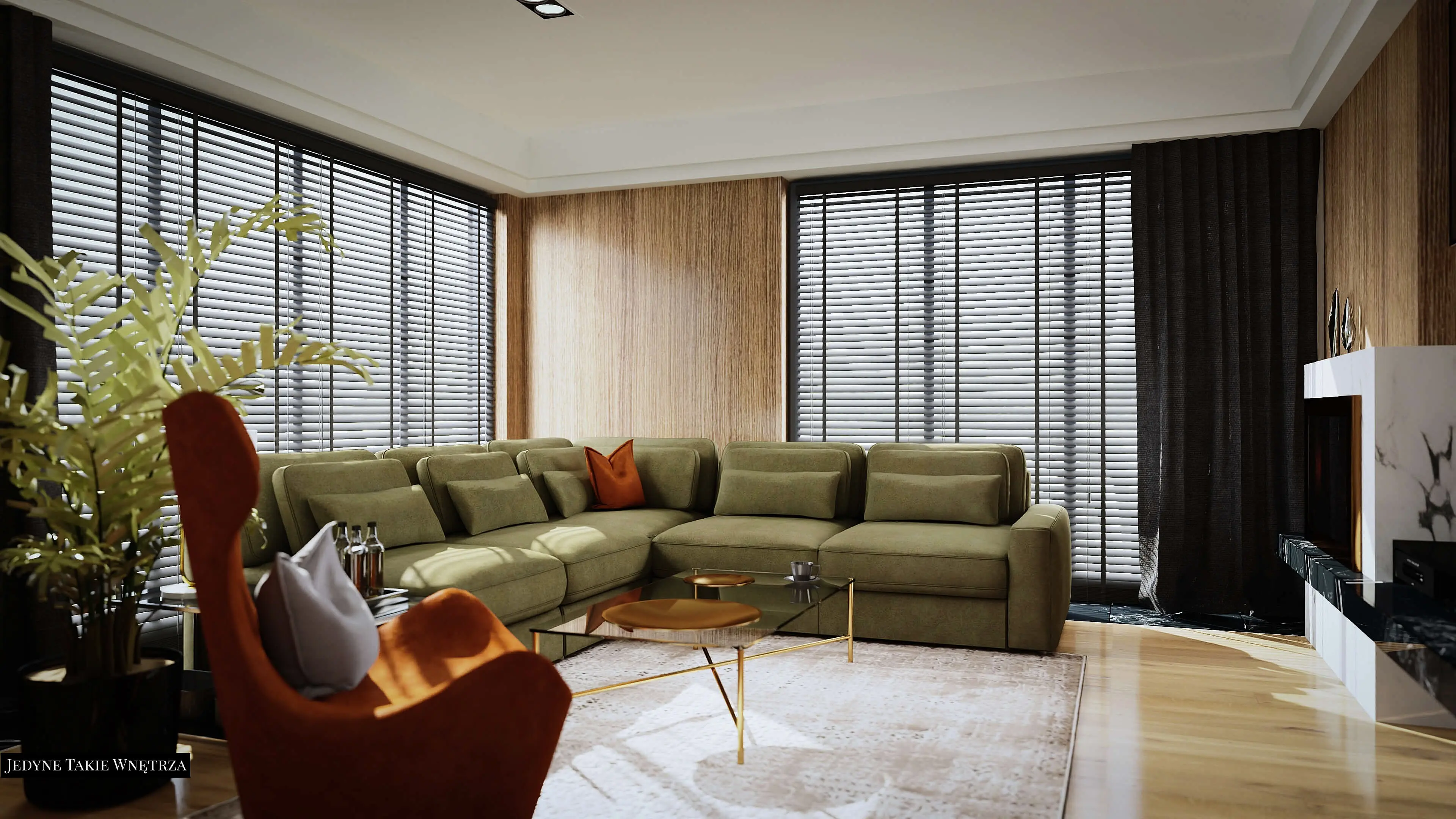 Eleganckie wnętrza salonu z kuchnią z wyspą.