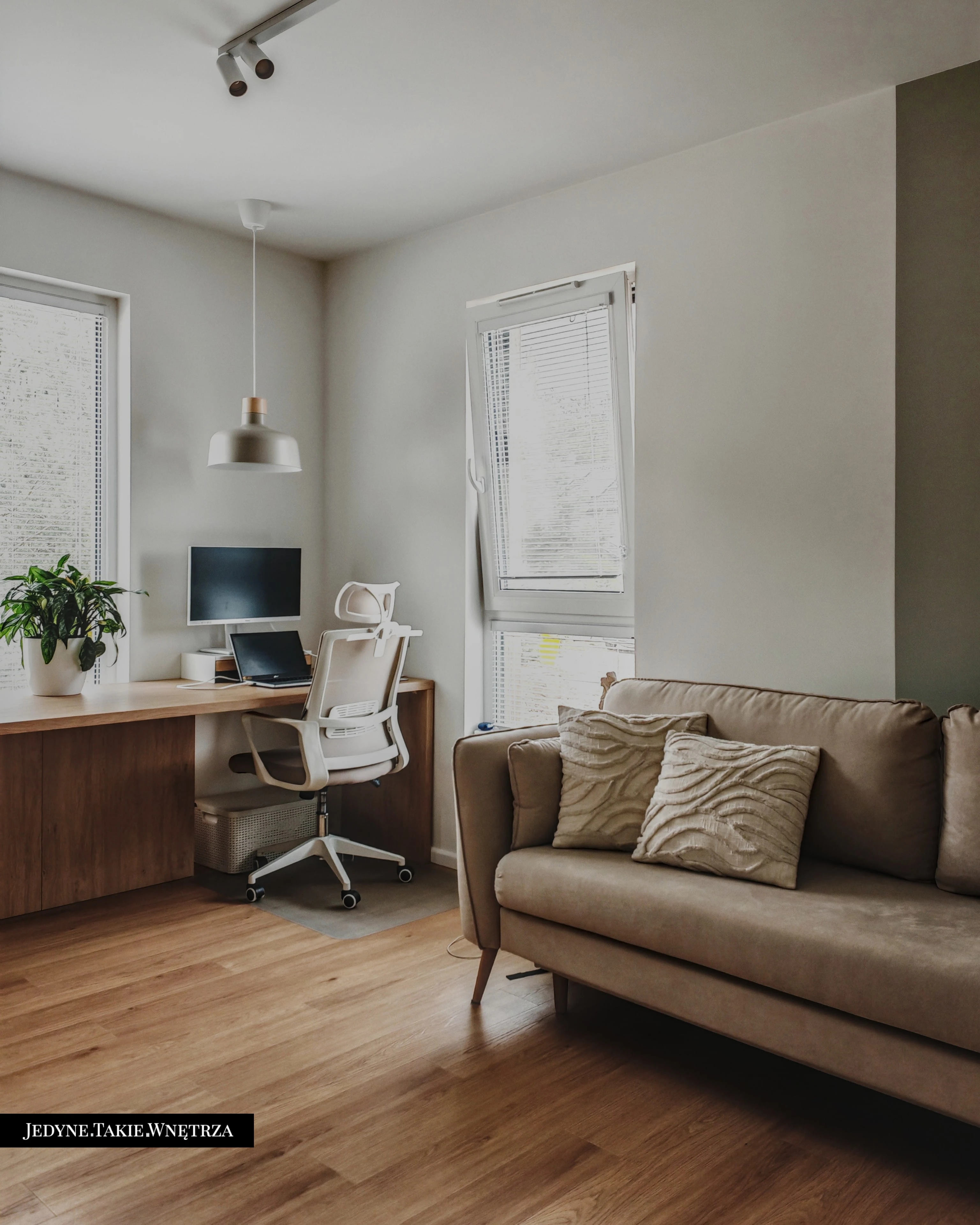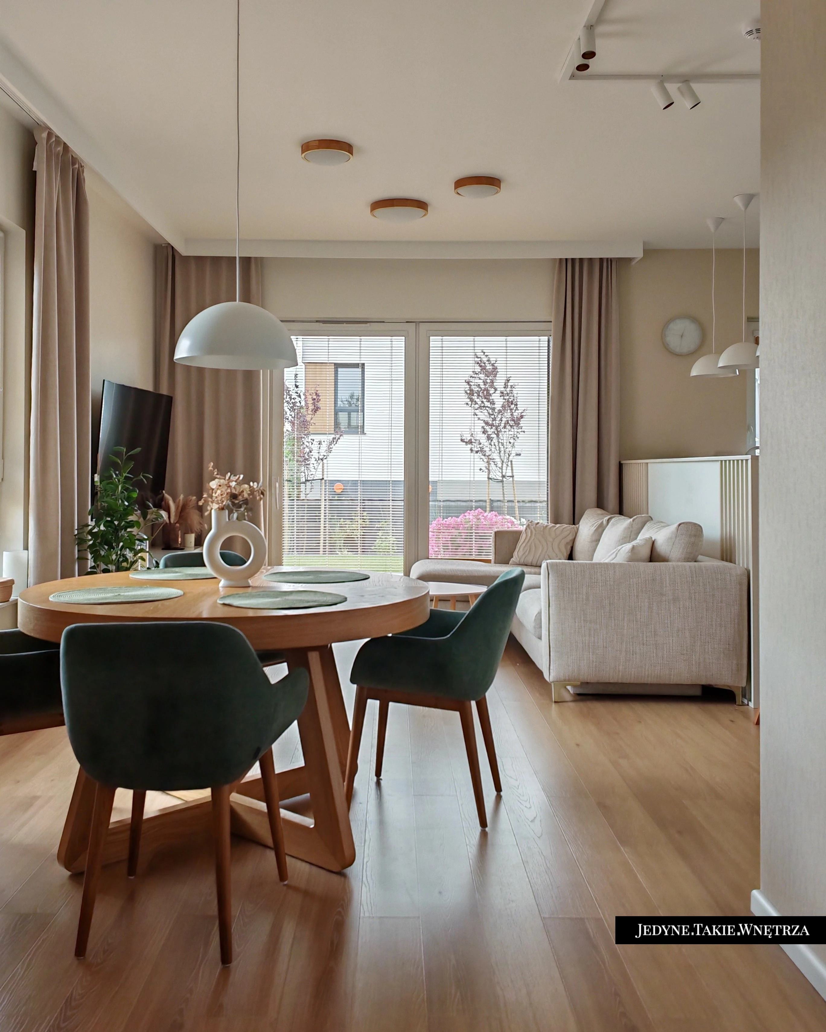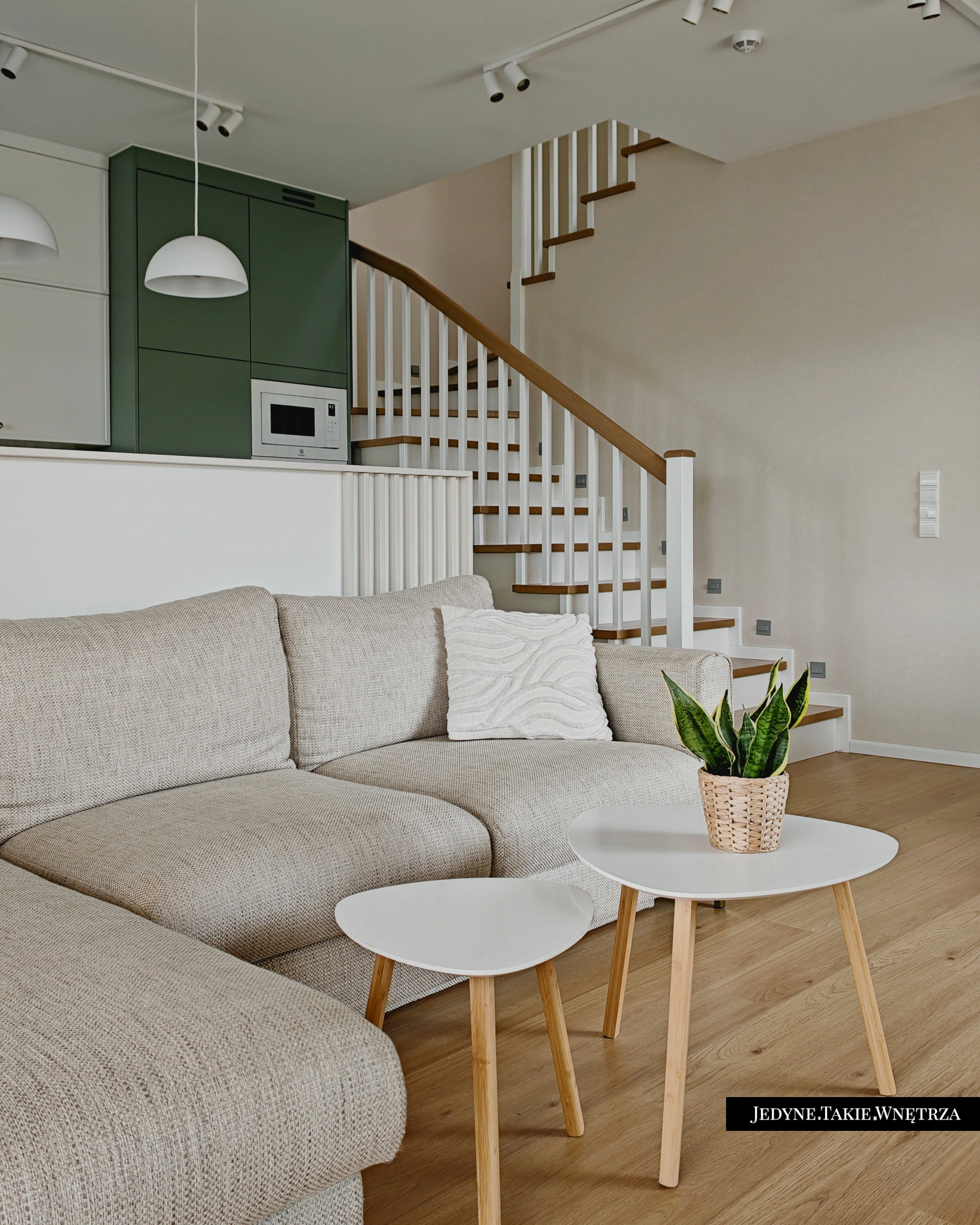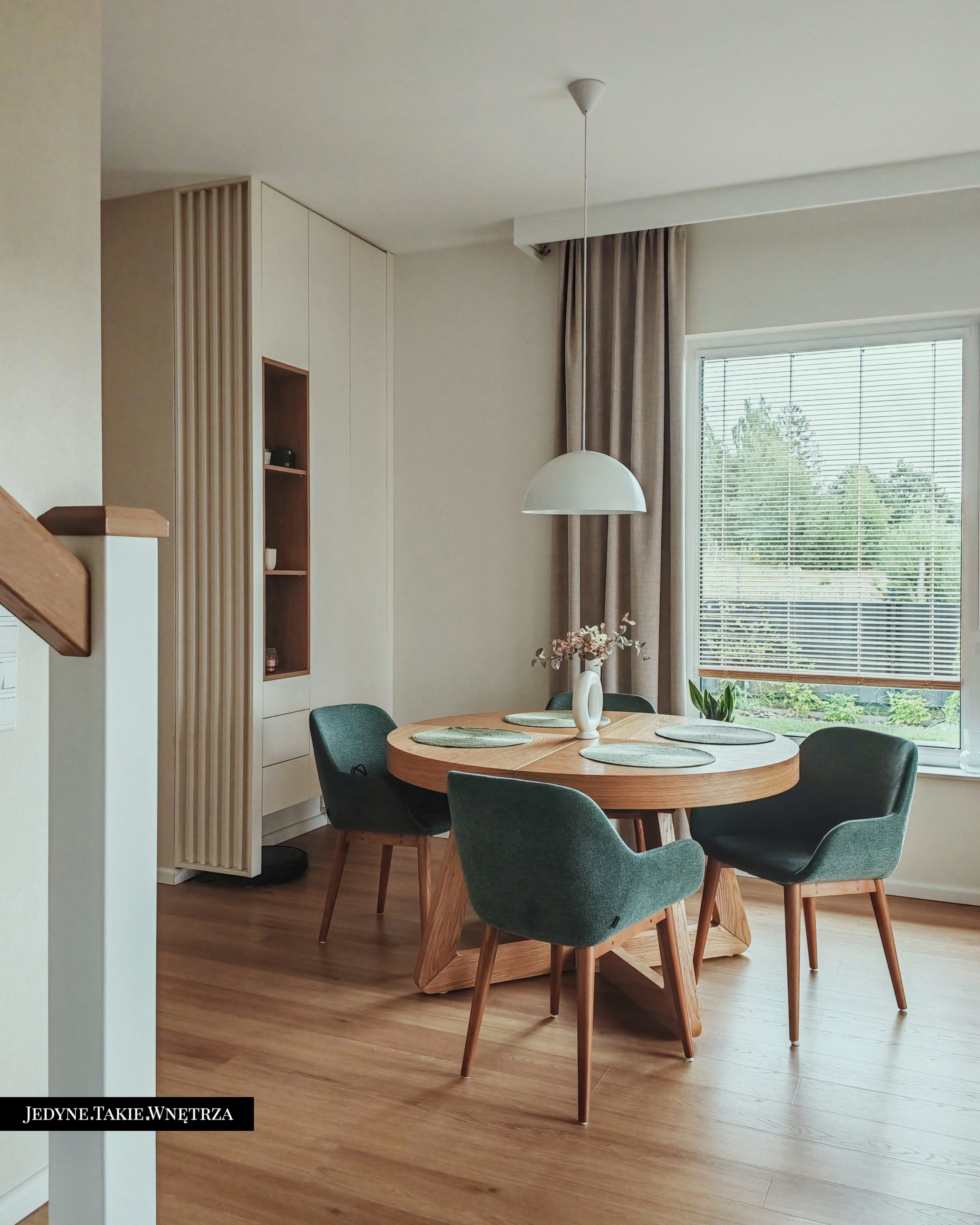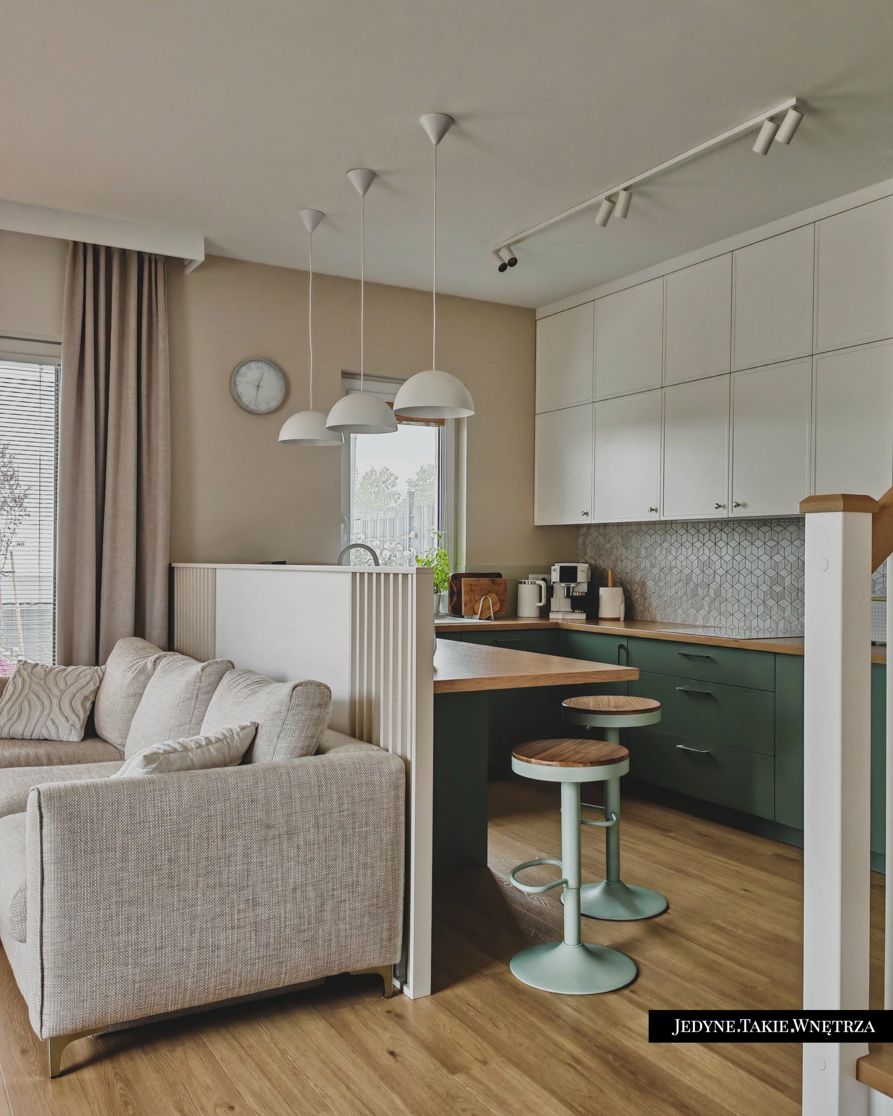 Eklektyczny projekt wnętrza domu jednorodzinnego obejmujący strefę dzienną z kuchnią i jadalnią, salon, sypialnię, łazienkę oraz domowe biuro. Jasne drewno, beże i zielone akcenty tworzą funkcjonalną, spokojną i ponadczasową przestrzeń dopasowaną do potrzeb rodziny. Estetyka łączy akcenty stylu boho z skandynawskim nastrojem.