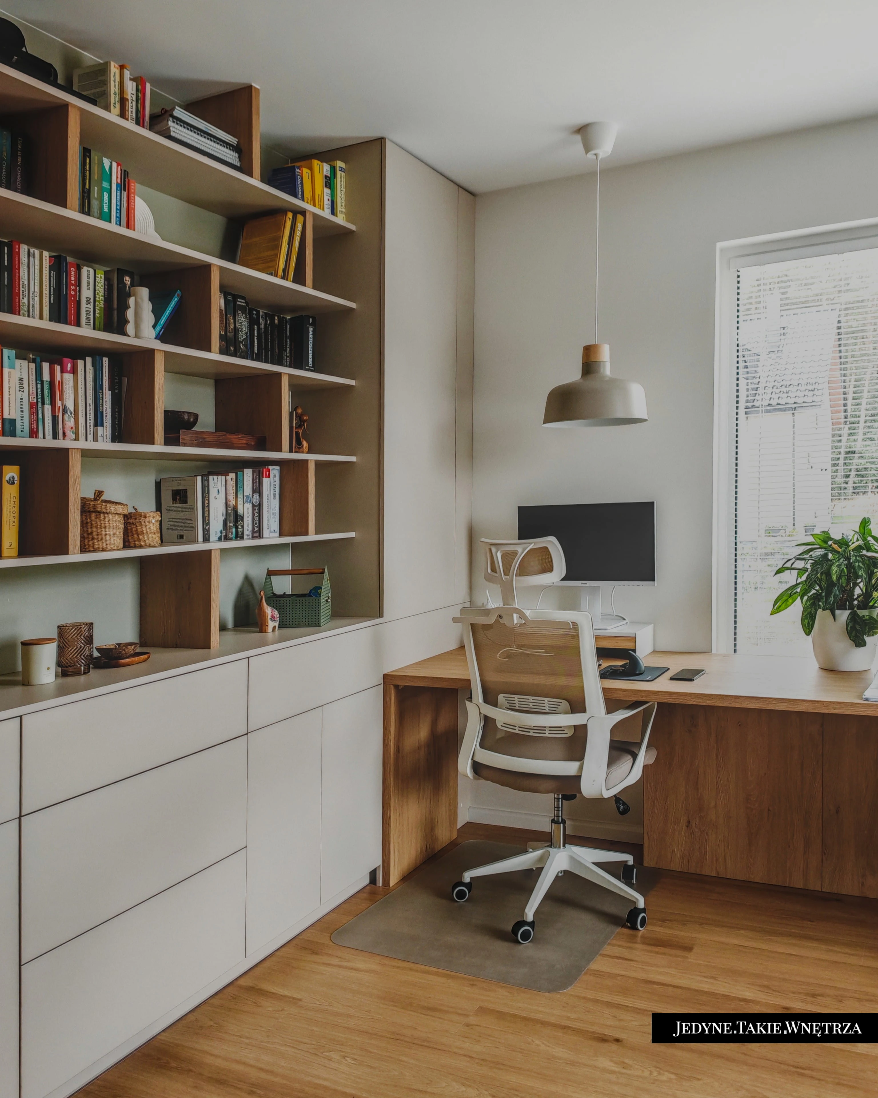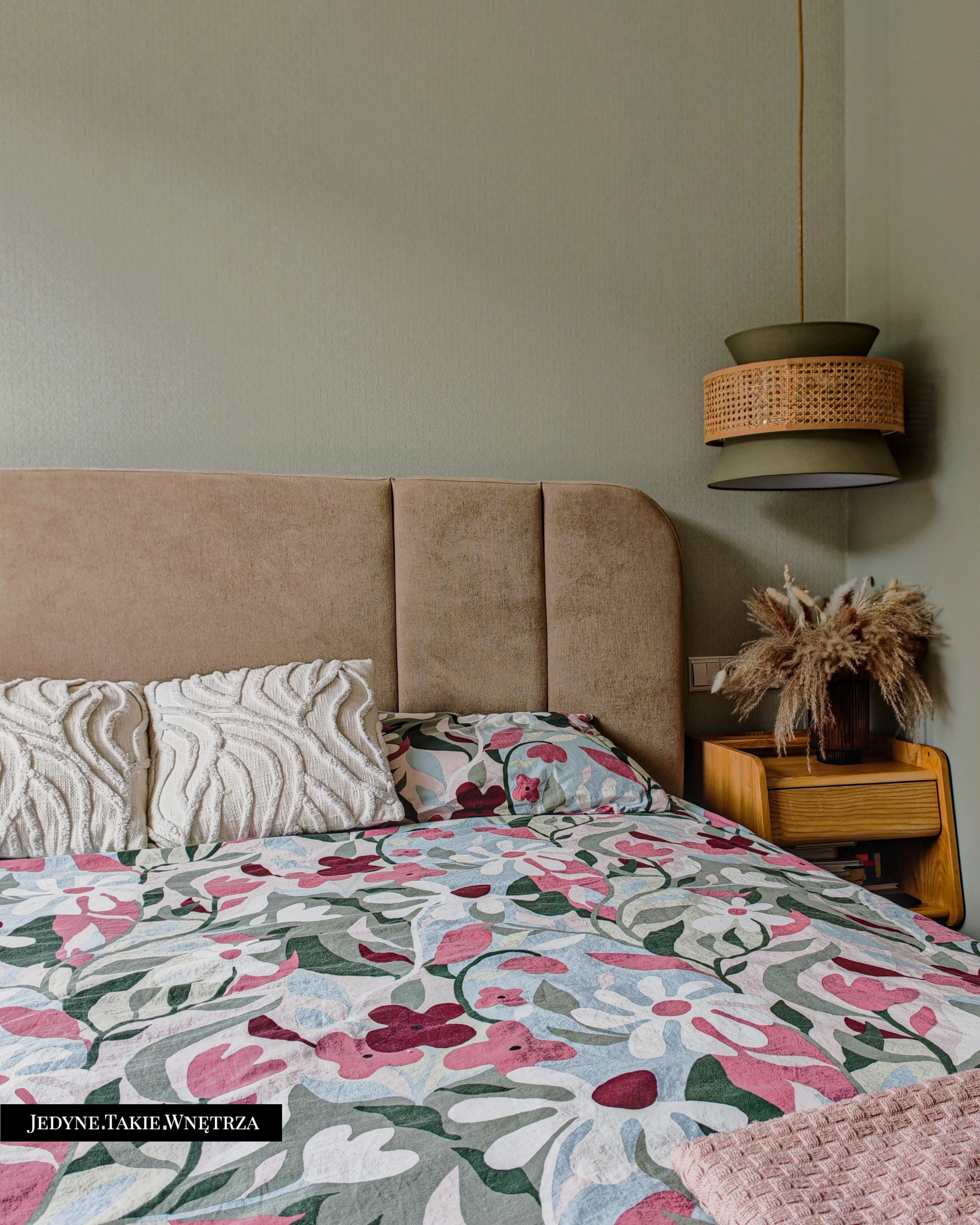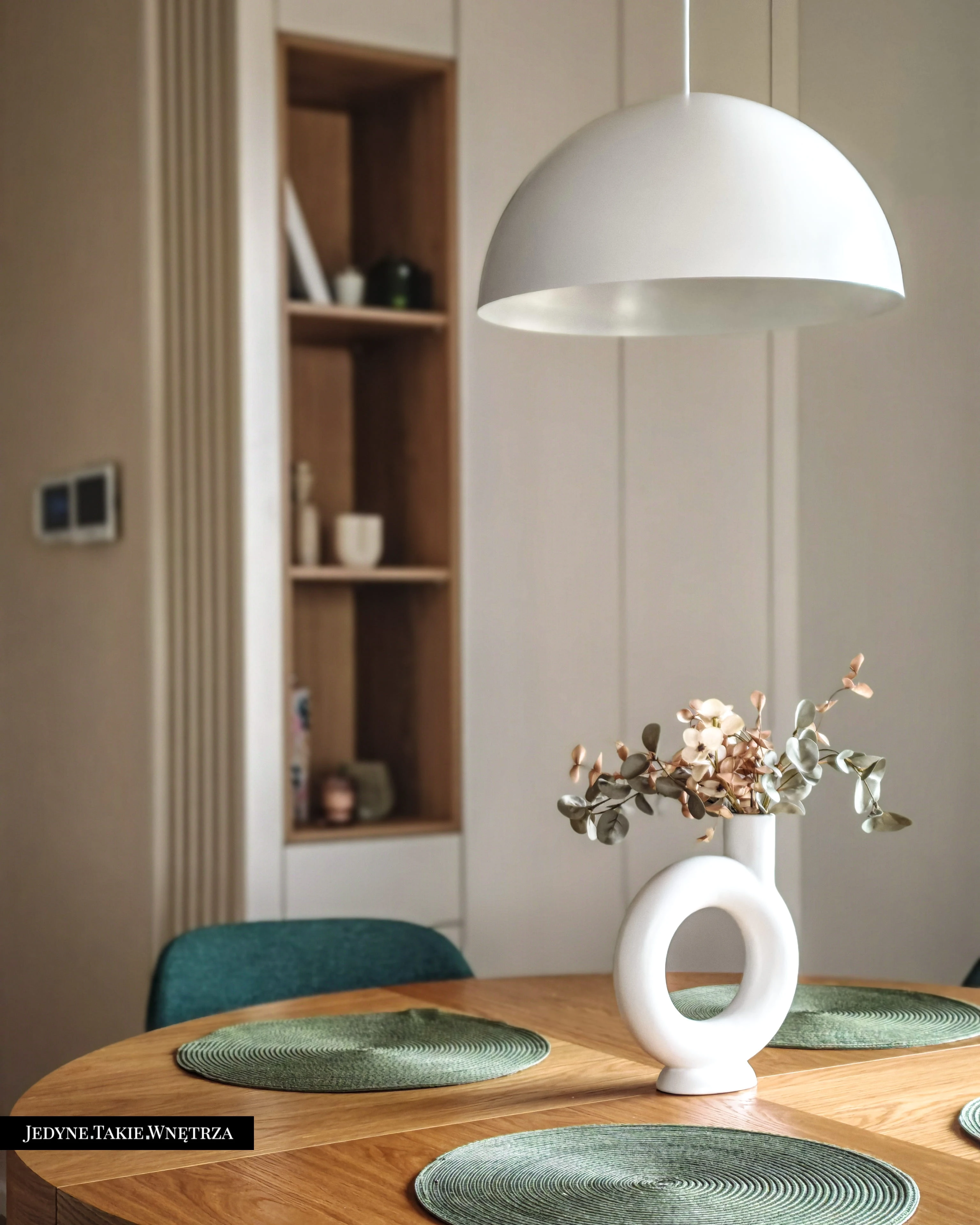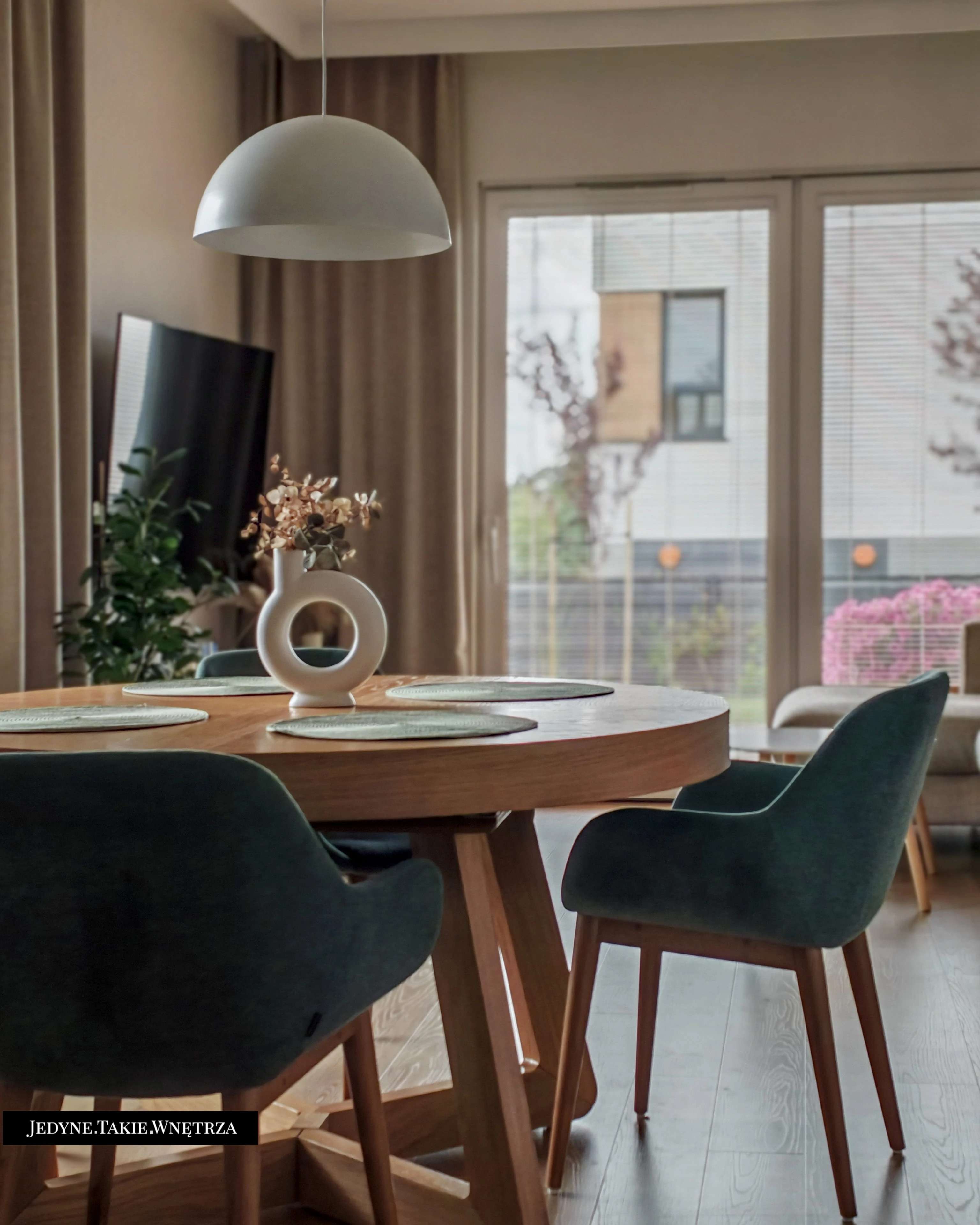 Eklektyczny projekt wnętrza domu jednorodzinnego obejmujący strefę dzienną z kuchnią i jadalnią, salon, sypialnię, łazienkę oraz domowe biuro. Jasne drewno, beże i zielone akcenty tworzą funkcjonalną, spokojną i ponadczasową przestrzeń dopasowaną do potrzeb rodziny. Estetyka łączy akcenty stylu boho z skandynawskim nastrojem.