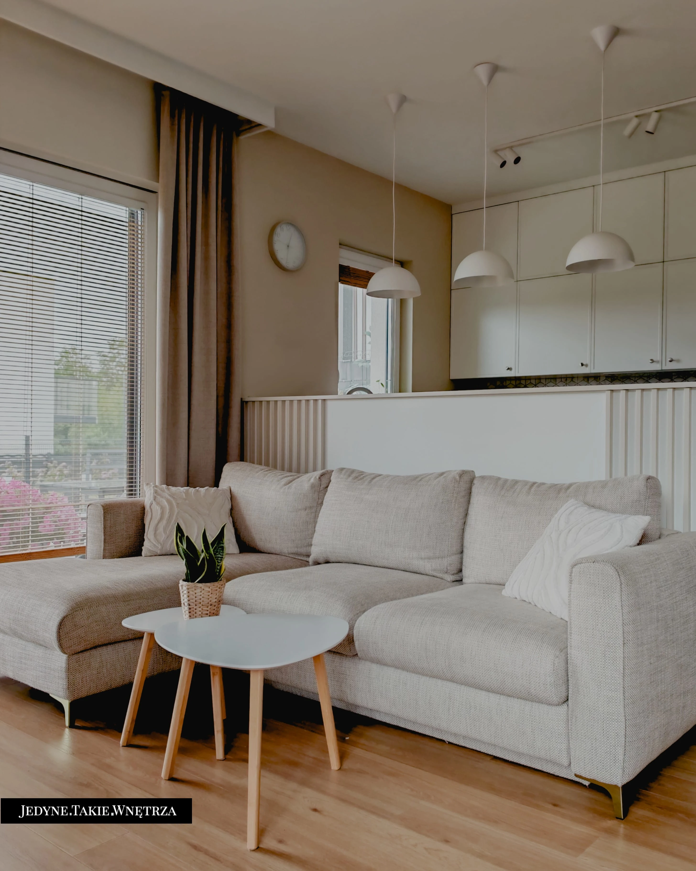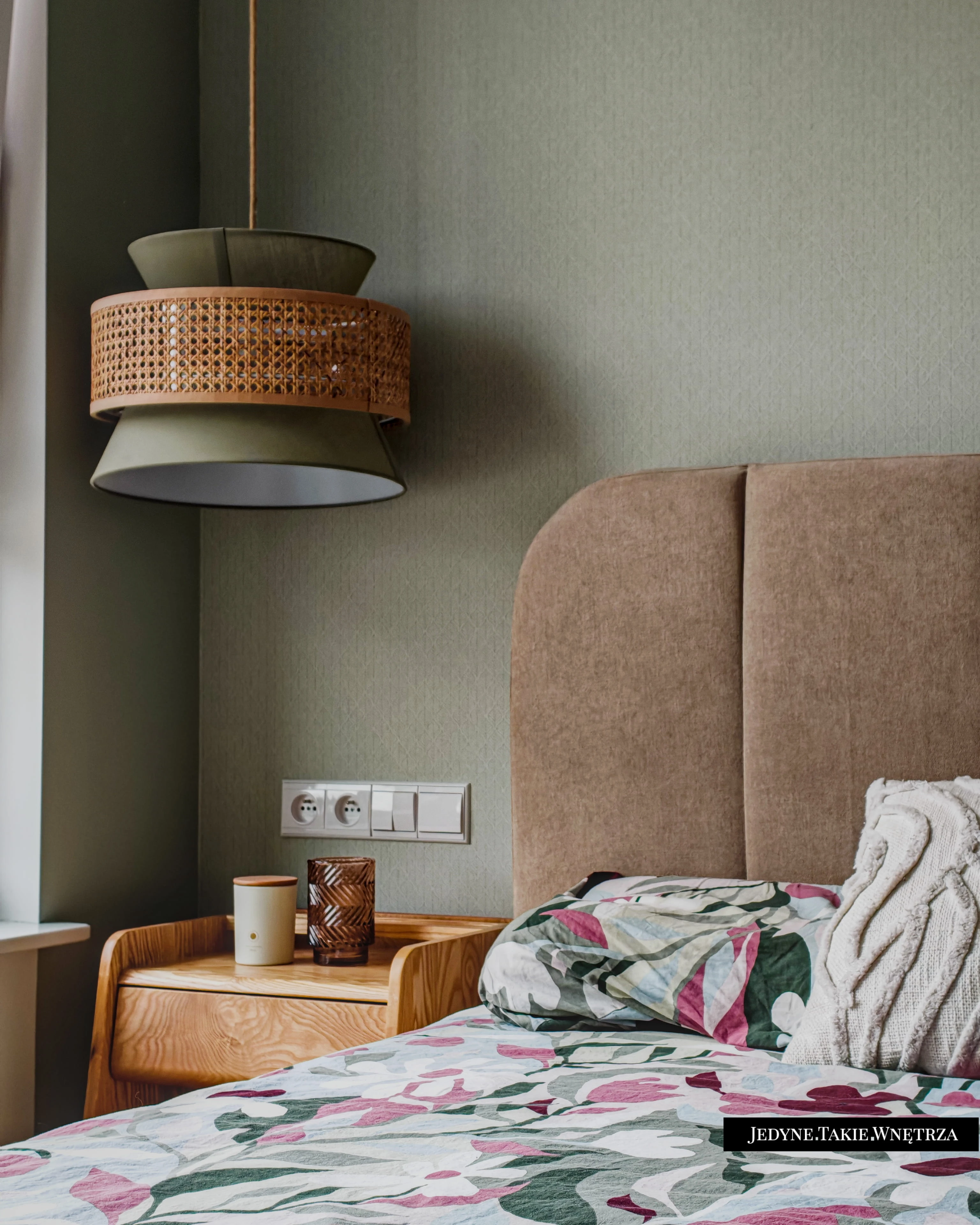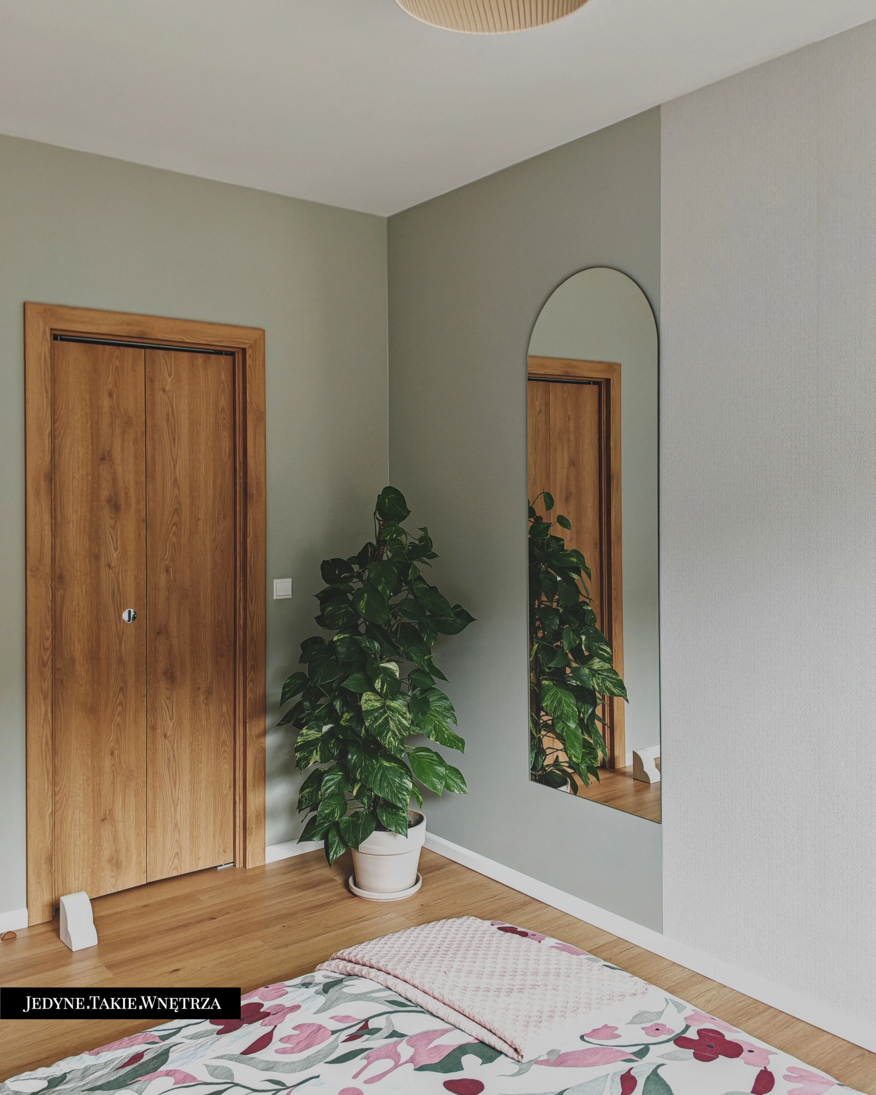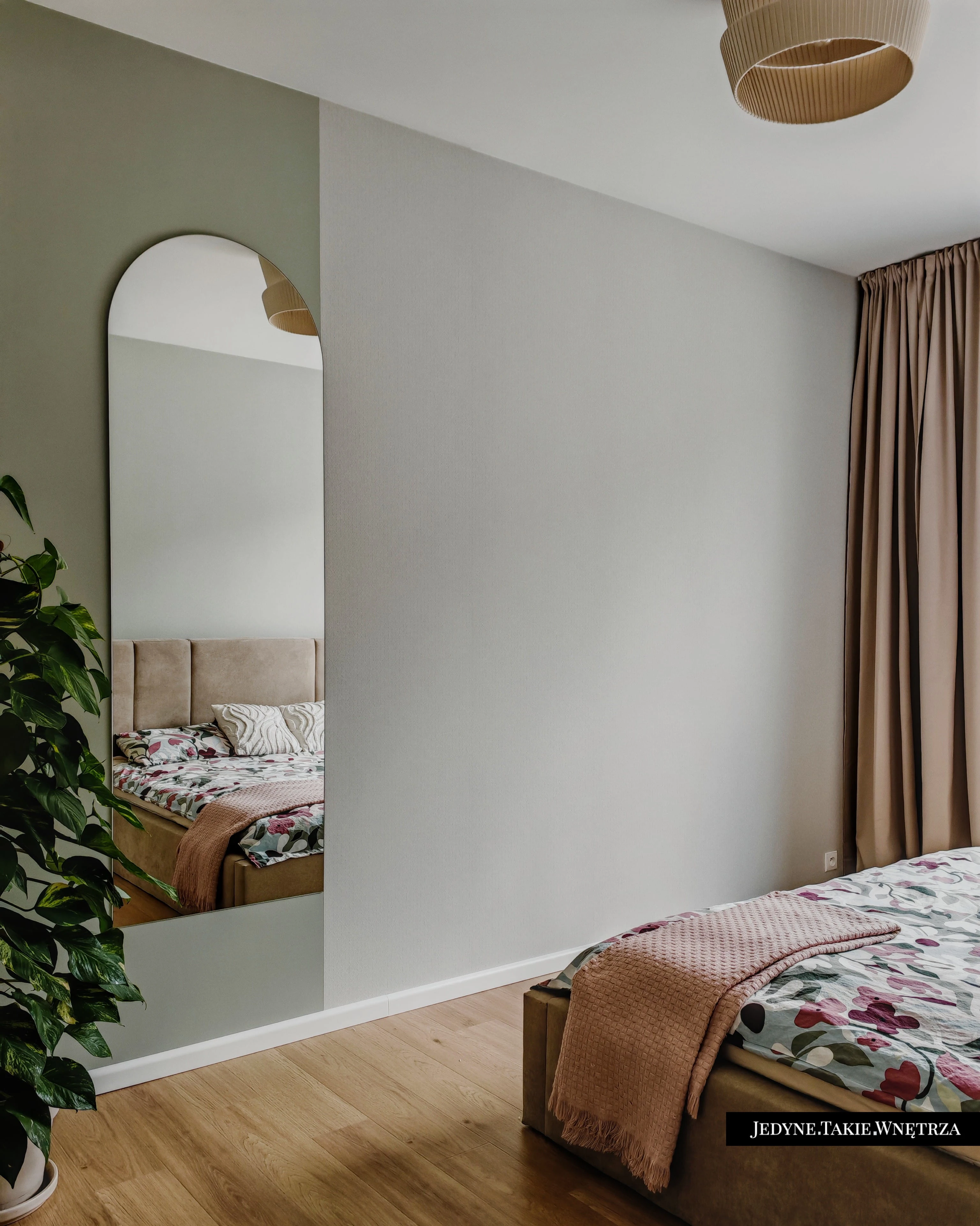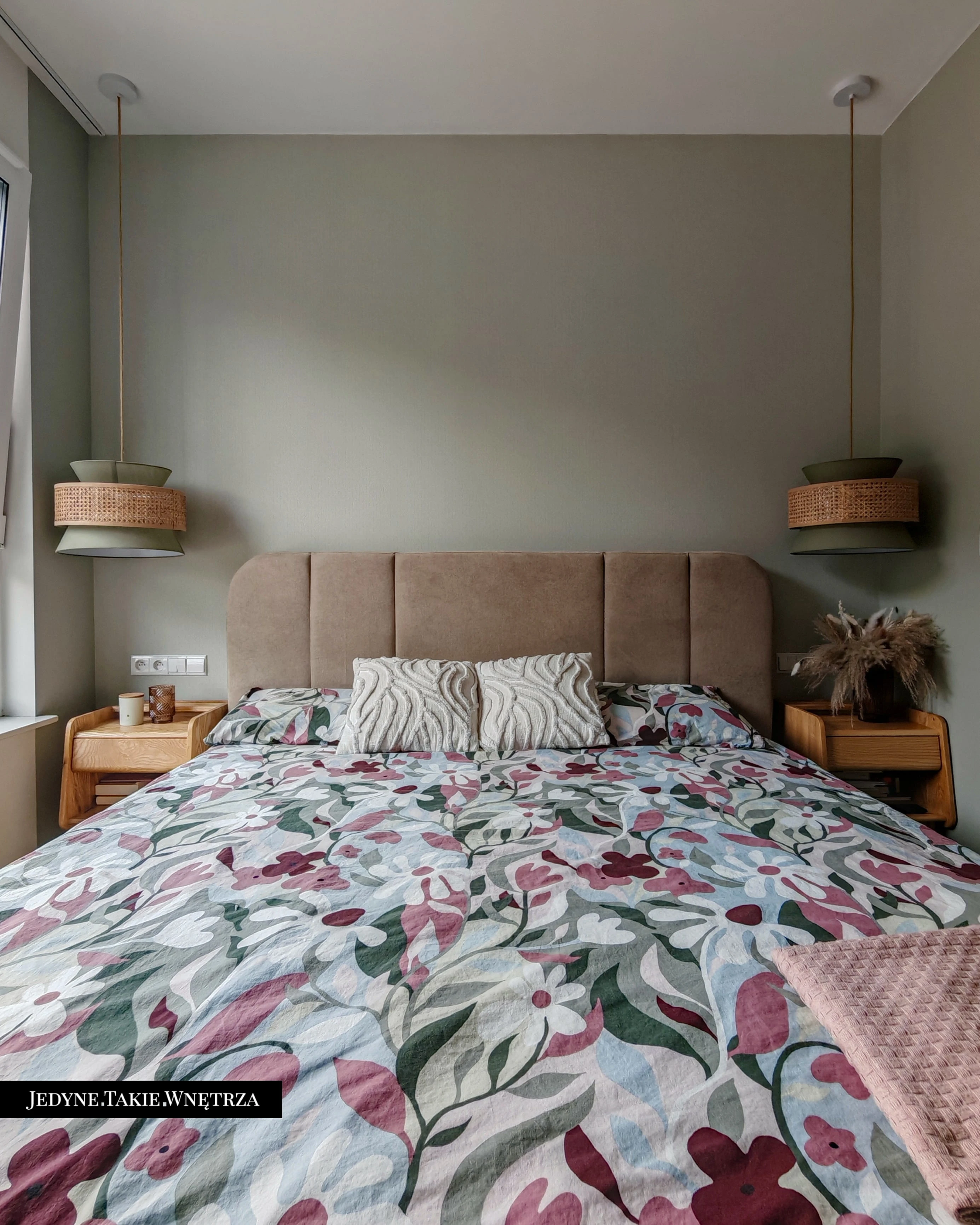 Eklektyczny projekt wnętrza domu jednorodzinnego obejmujący strefę dzienną z kuchnią i jadalnią, salon, sypialnię, łazienkę oraz domowe biuro. Jasne drewno, beże i zielone akcenty tworzą funkcjonalną, spokojną i ponadczasową przestrzeń dopasowaną do potrzeb rodziny. Estetyka łączy akcenty stylu boho z skandynawskim nastrojem.