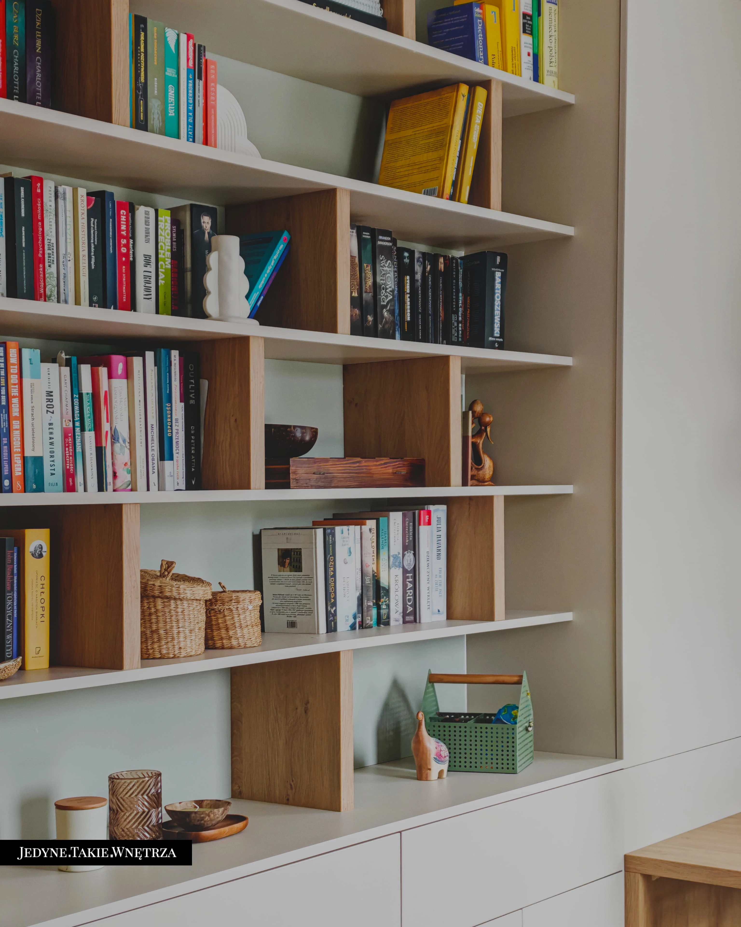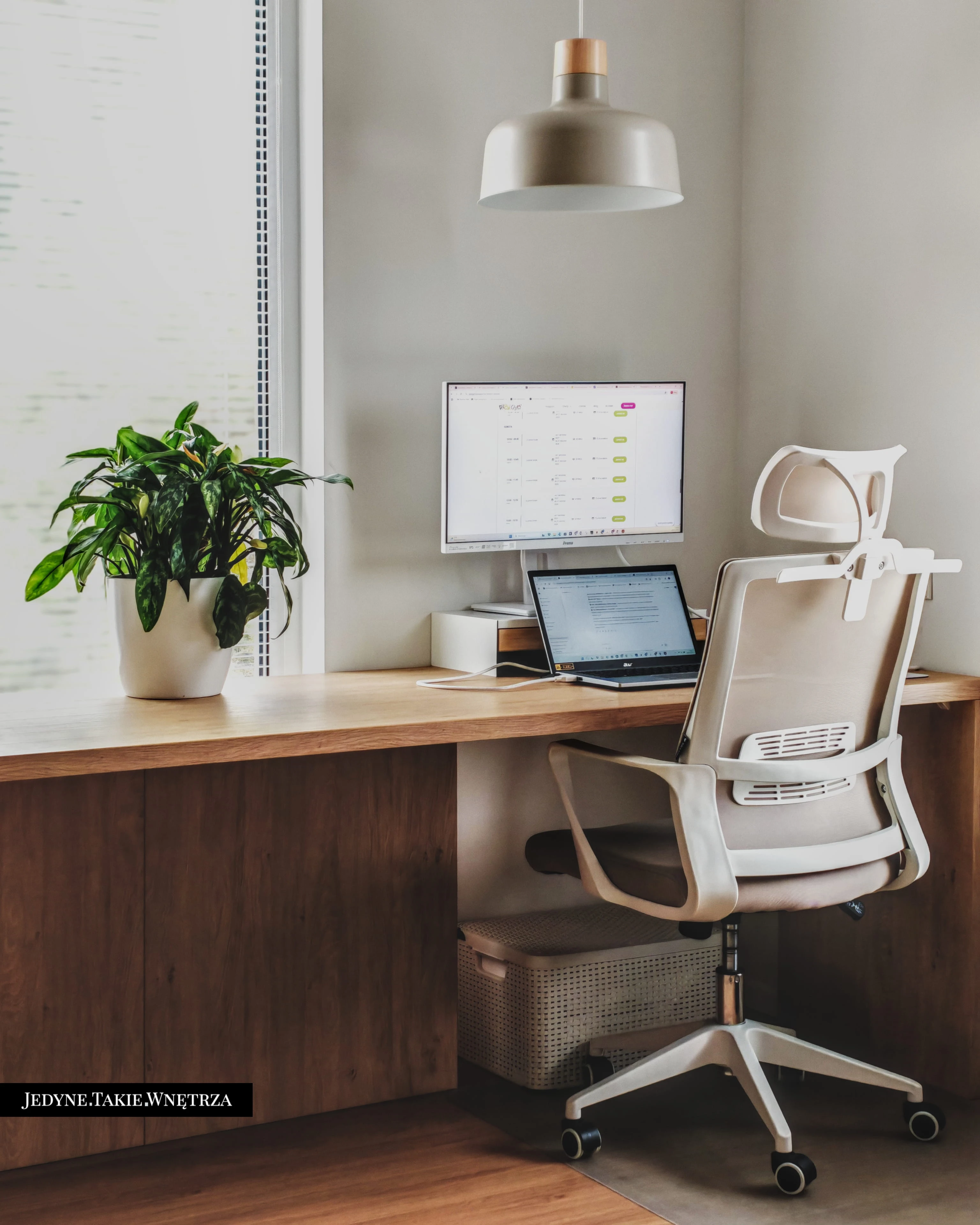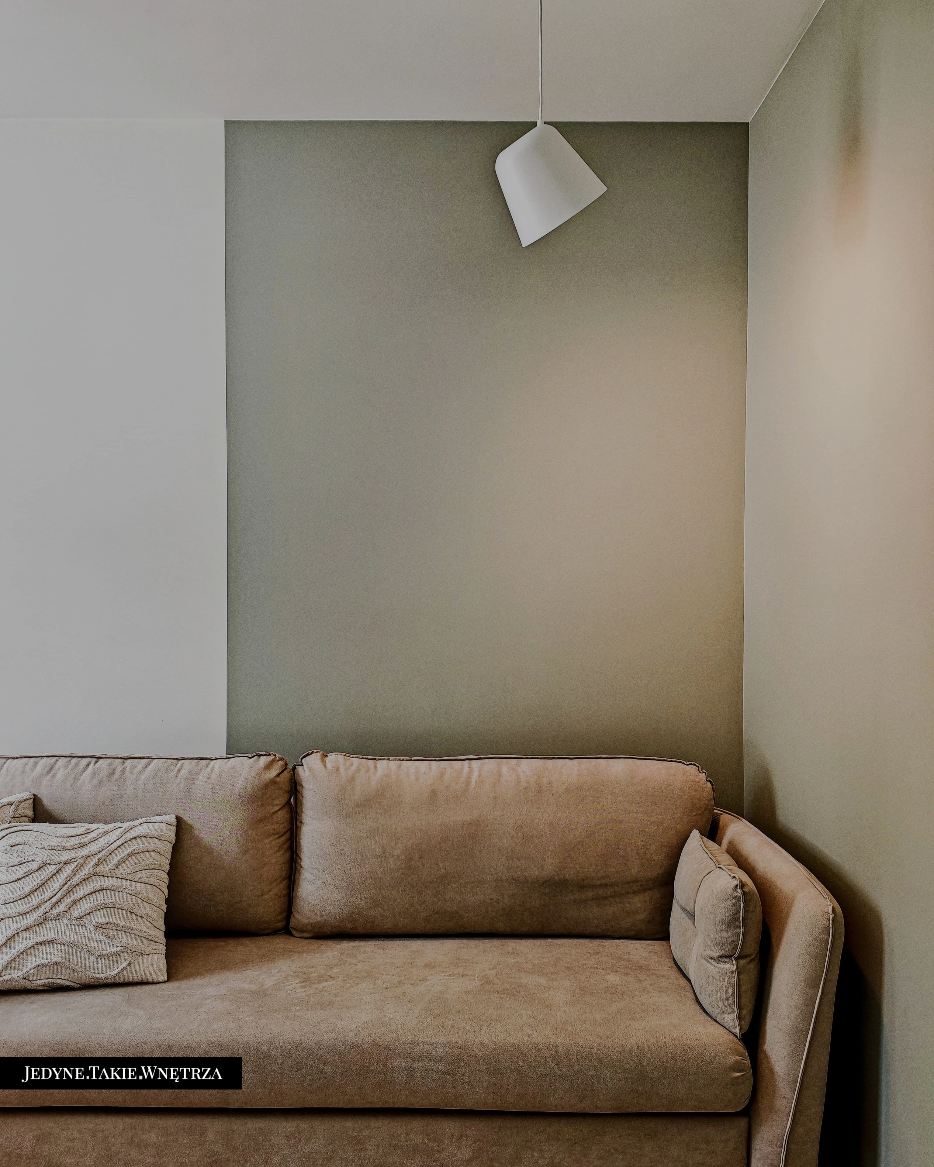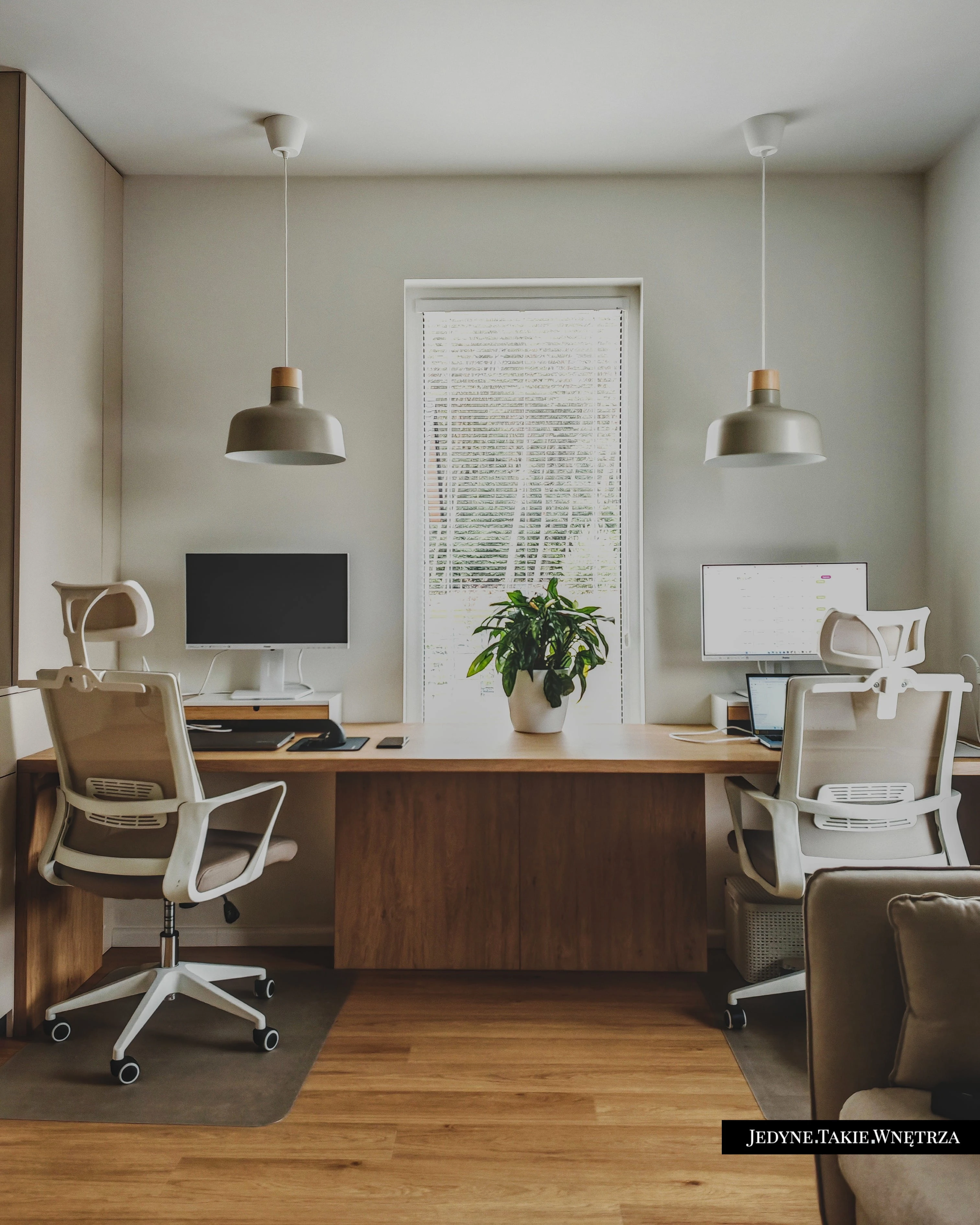 Eklektyczny projekt wnętrza domu jednorodzinnego obejmujący strefę dzienną z kuchnią i jadalnią, salon, sypialnię, łazienkę oraz domowe biuro. Jasne drewno, beże i zielone akcenty tworzą funkcjonalną, spokojną i ponadczasową przestrzeń dopasowaną do potrzeb rodziny. Estetyka łączy akcenty stylu boho z skandynawskim nastrojem.
