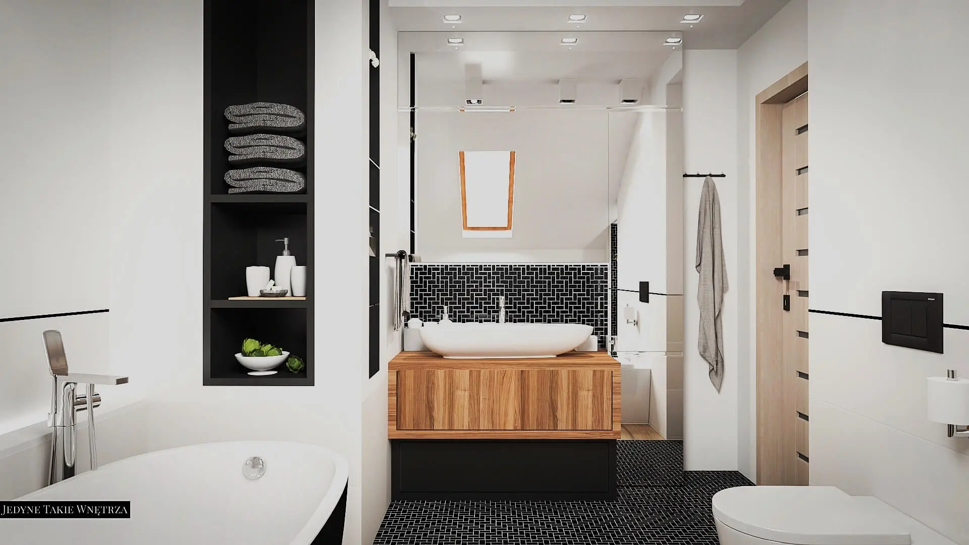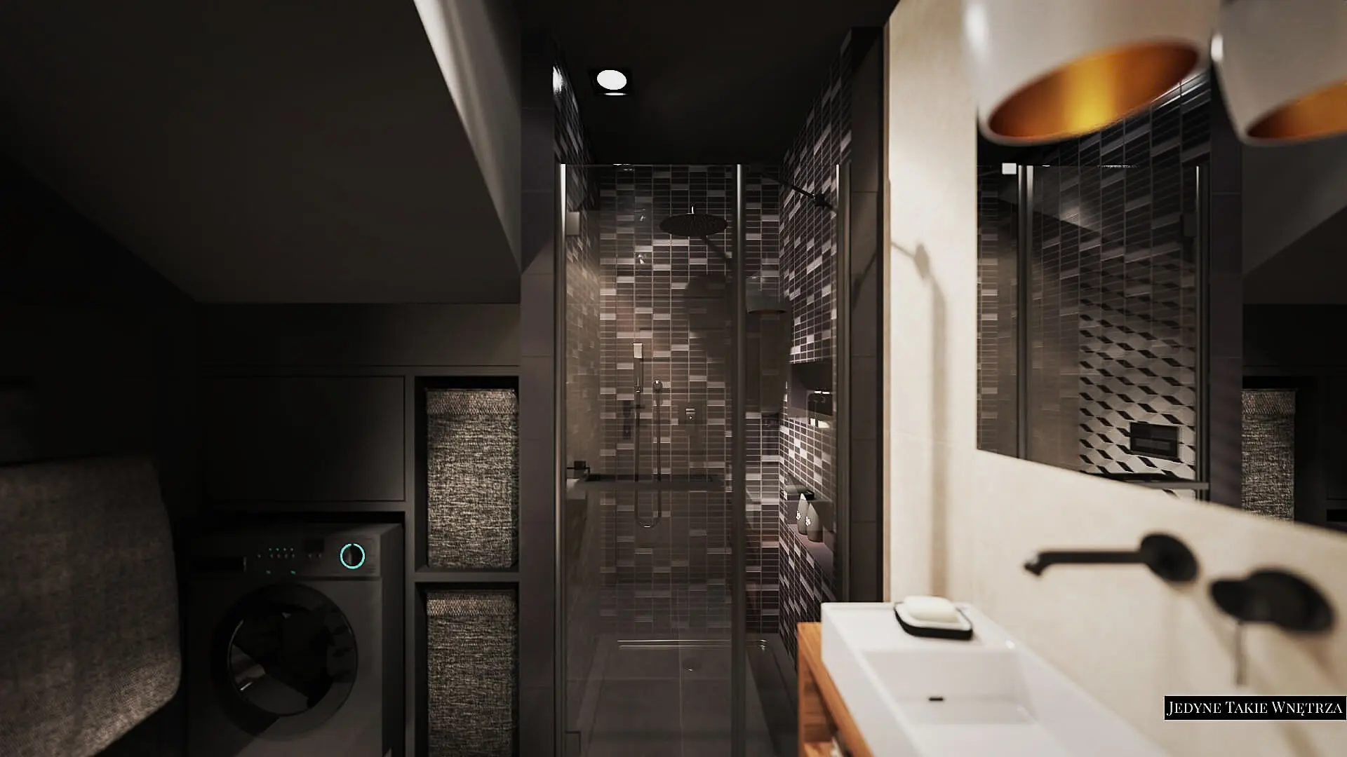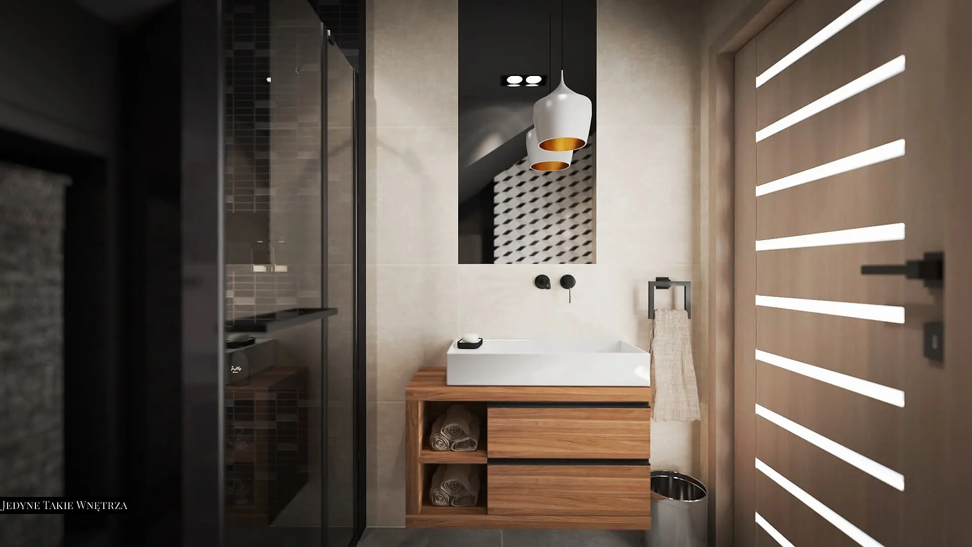 Projekt pokoju kąpielowego na poddaszu i projekt łazienki z prysznicem pod schodami stanowią część projektu wnętrz domu pod Krakowem.