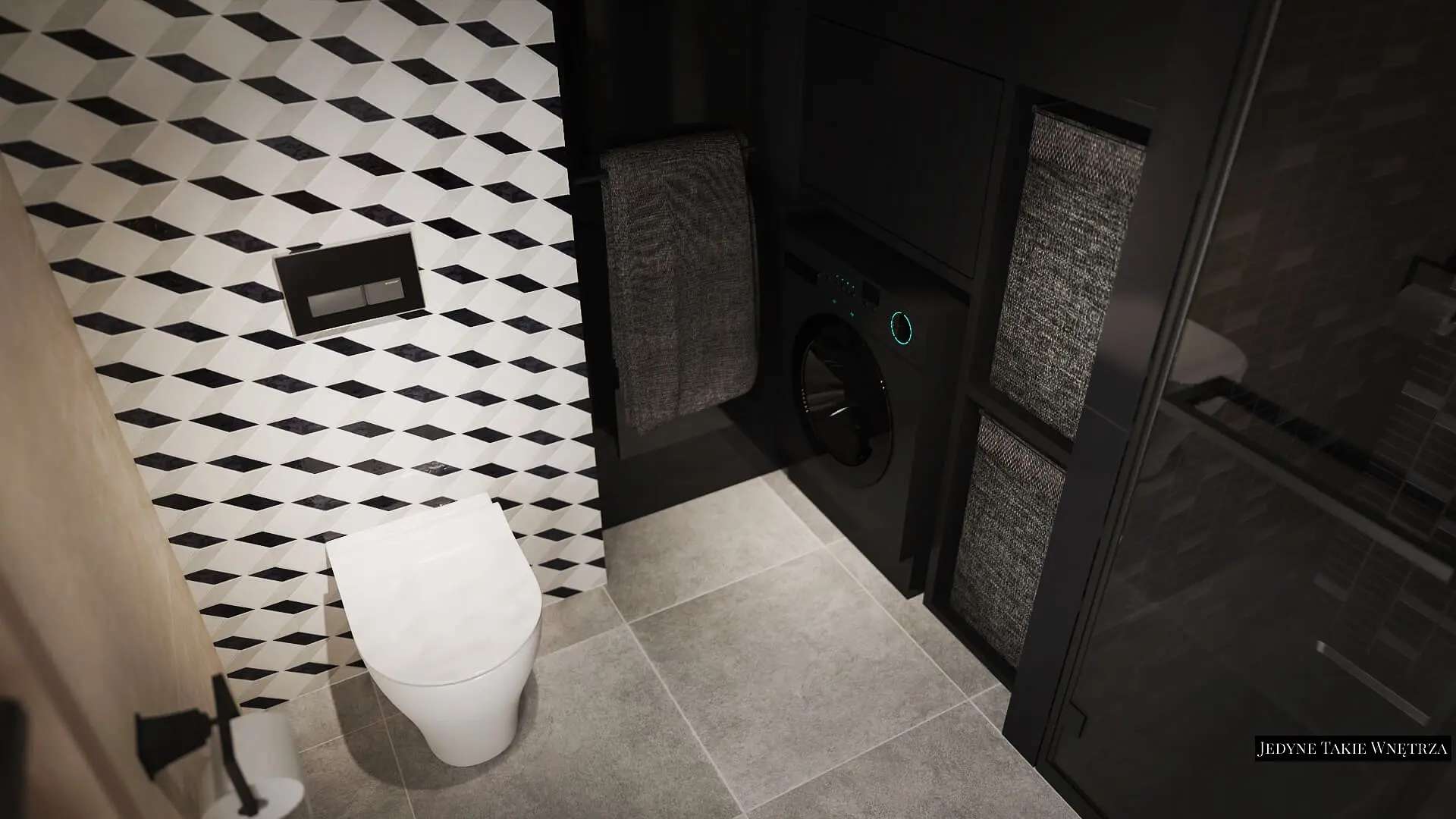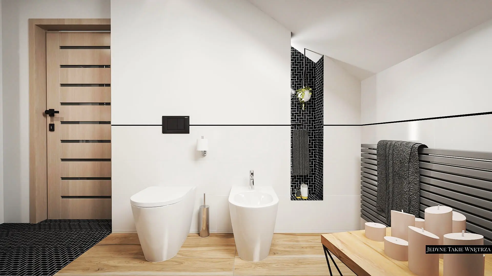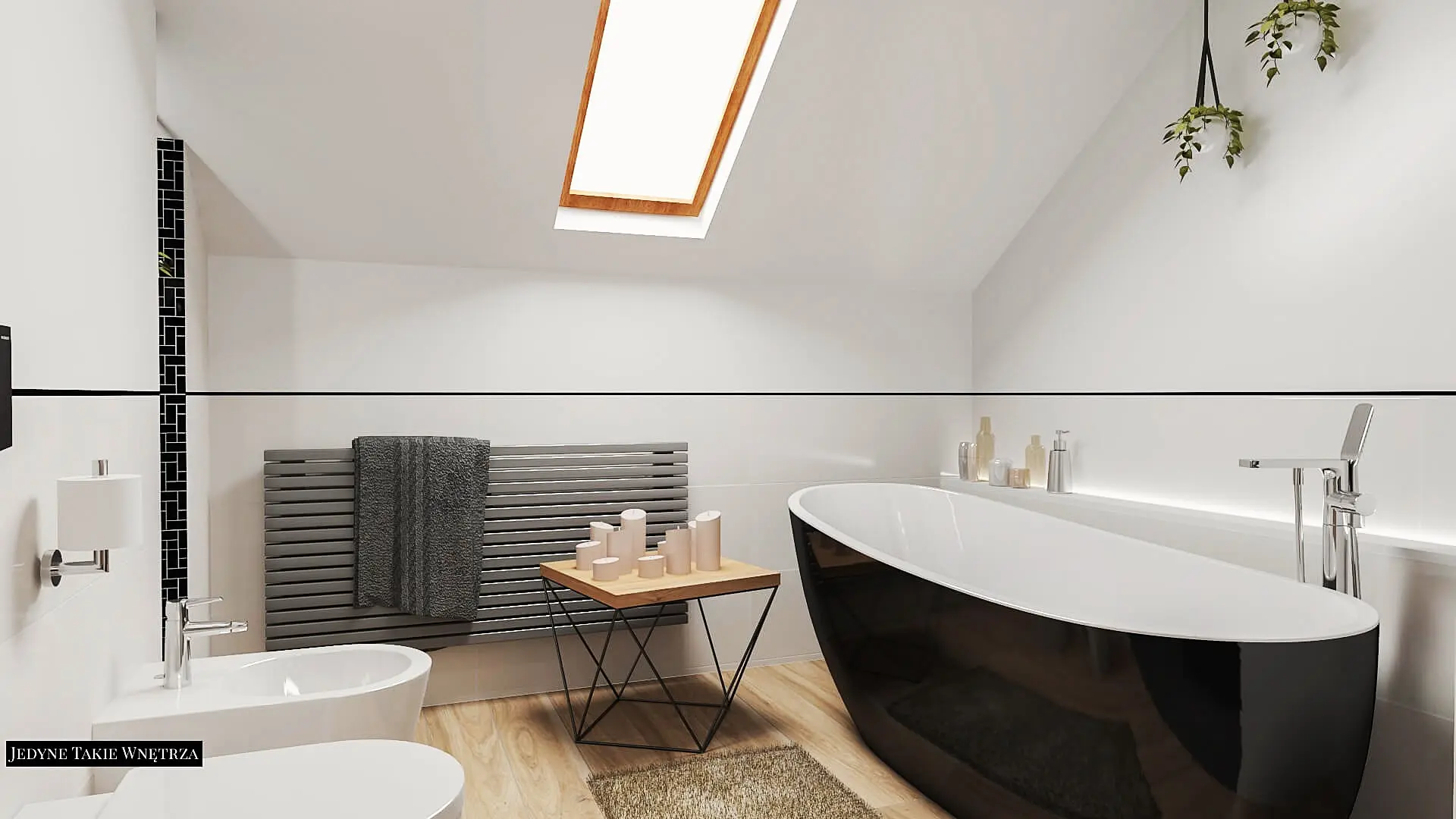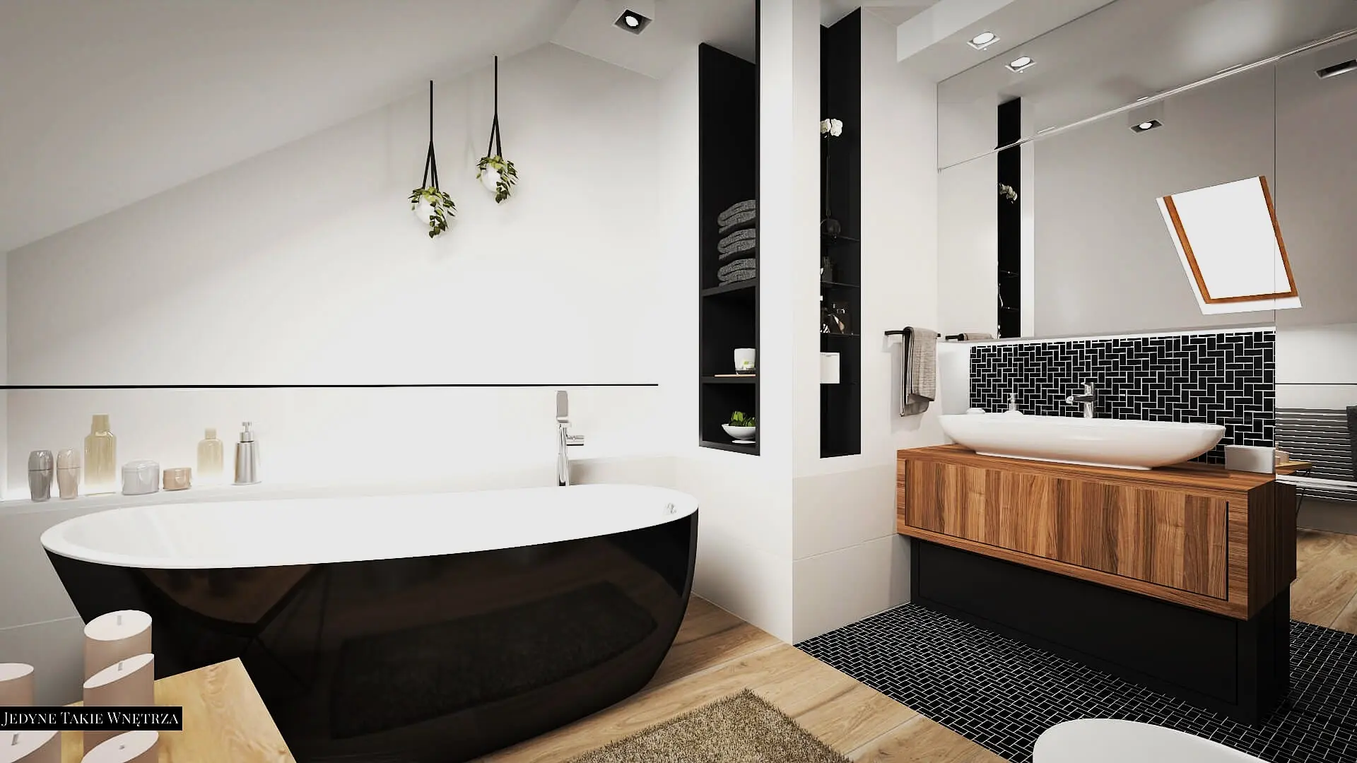 Projekt pokoju kąpielowego na poddaszu i projekt łazienki z prysznicem pod schodami stanowią część projektu wnętrz domu pod Krakowem.