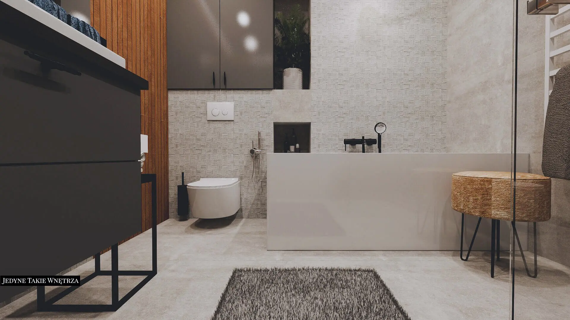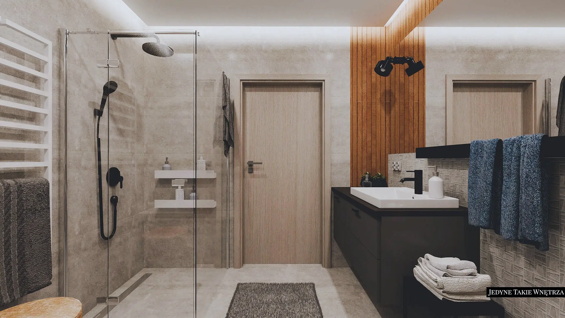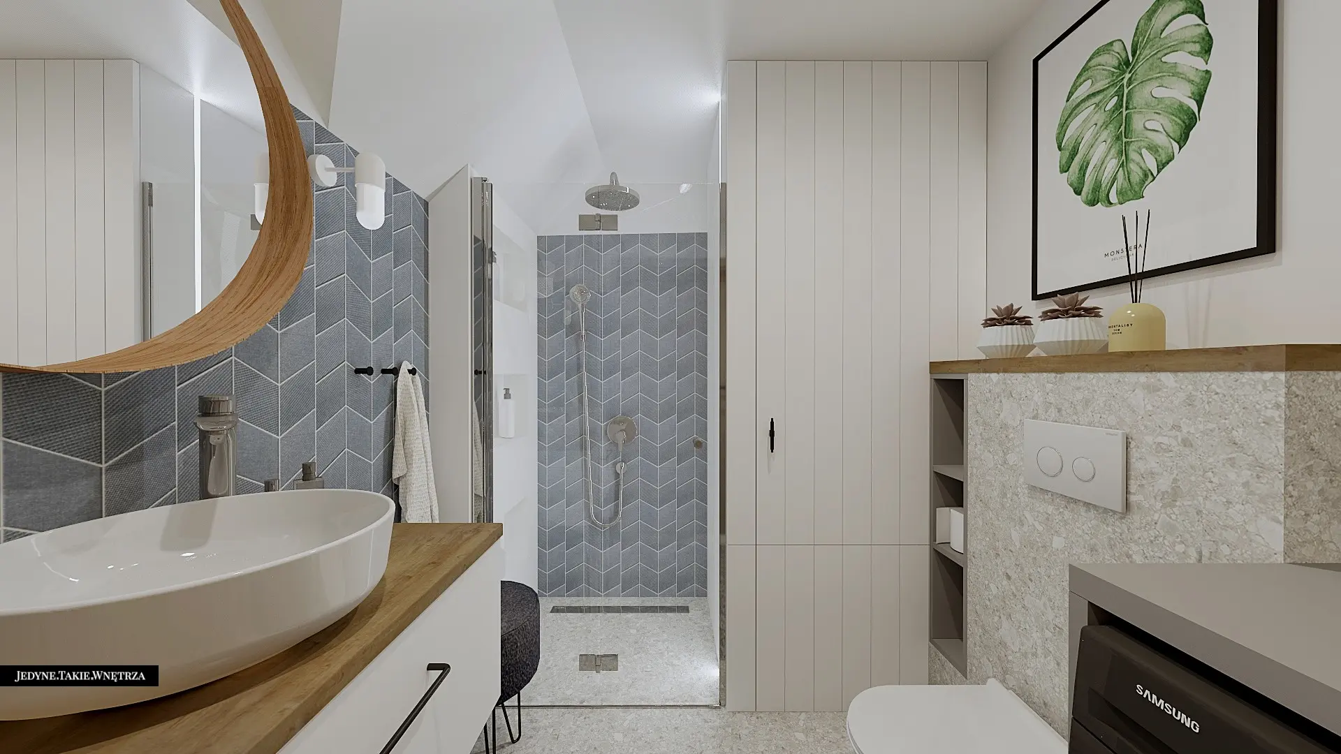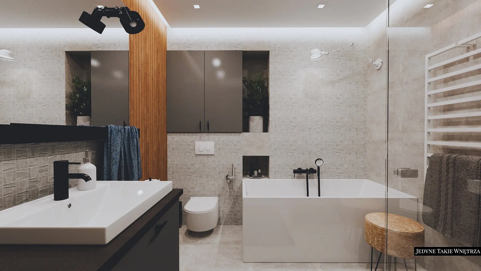 Projekt toalety, łazienki dzieci i pokoju kąpielowego w stylu skandynawskiego minimalizmu stanowi część projektu wnętrz domu w Krakowie.
