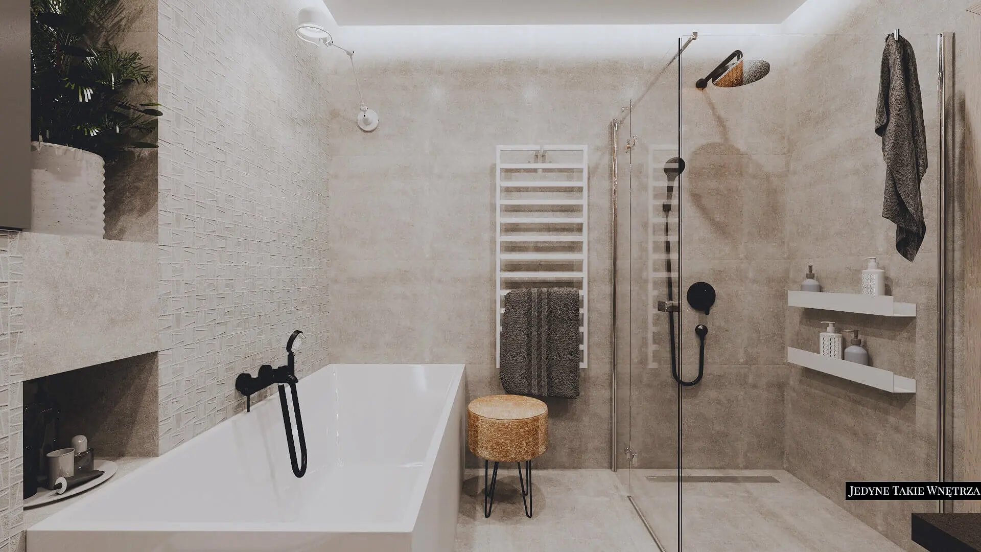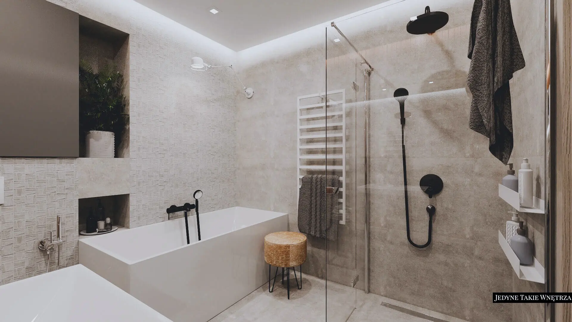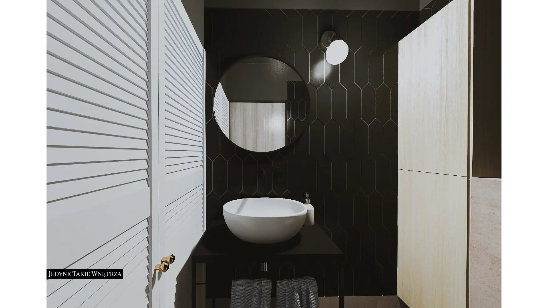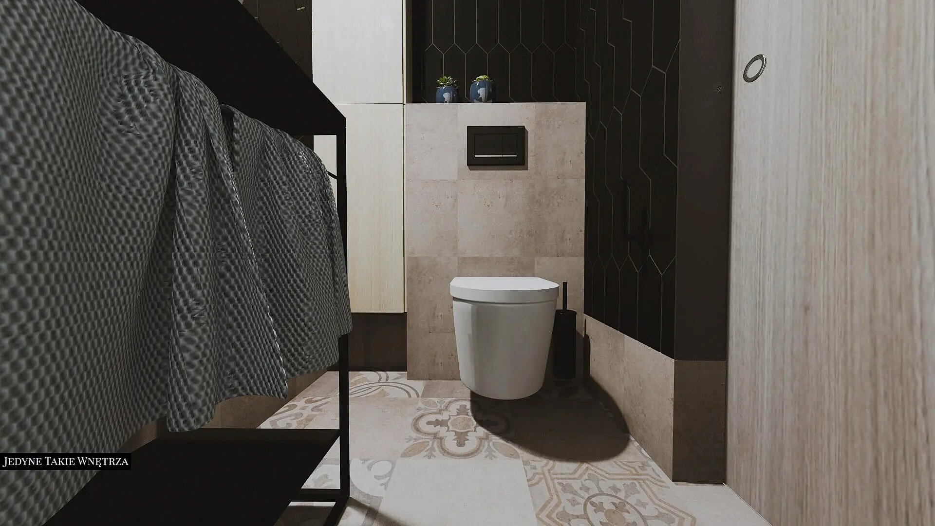 Projekt toalety, łazienki dzieci i pokoju kąpielowego w stylu skandynawskiego minimalizmu stanowi część projektu wnętrz domu w Krakowie.